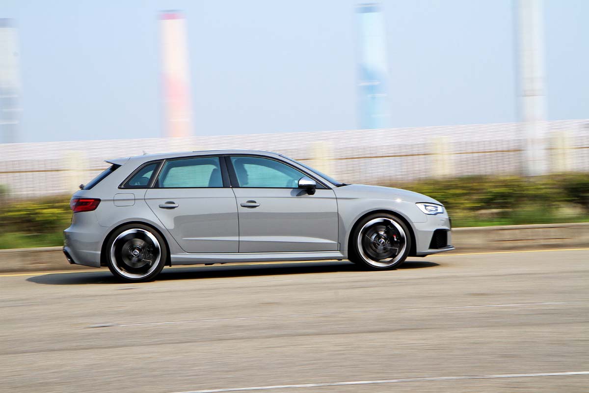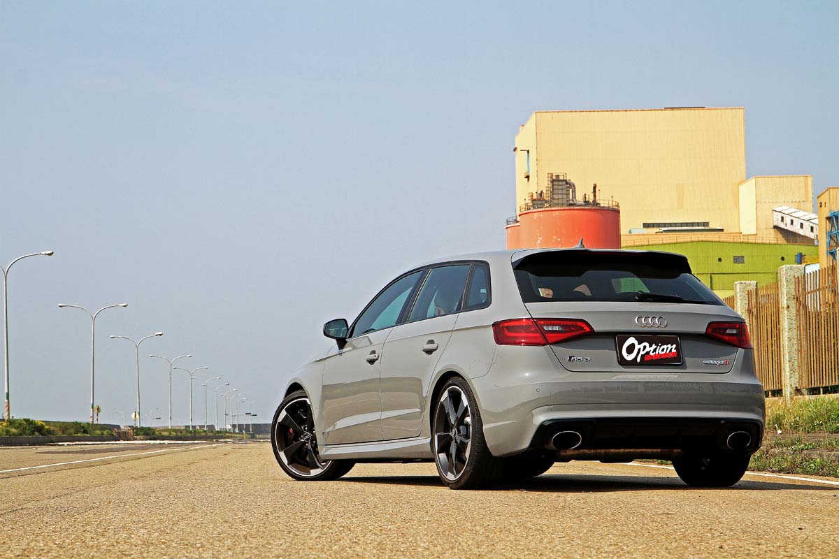 傳動系統部分則使用S Tronic 7速雙離合器自手排變速箱,並搭載quattro全時四驅系統,加上前麥花臣、後多連桿懸吊,與Audi drive select可程式車身動態穩定系統,使得RS 3 Sportback不論是直線加速或是出入彎道,都相當靈活迅速。外觀造型以霸氣的下保桿、家族特徵前臉與水箱護罩上的專屬標誌,彰顯出其運動小鋼砲地位,而碩大且誇張的下保桿飾條、利刃型HID頭燈、大面積網狀水箱護罩、19吋輪圈附亮黑RS字樣卡鉗、RS專屬車頂擾流尾翼和左右單出的排氣尾管,讓性能掀背車的形象不言可諭。