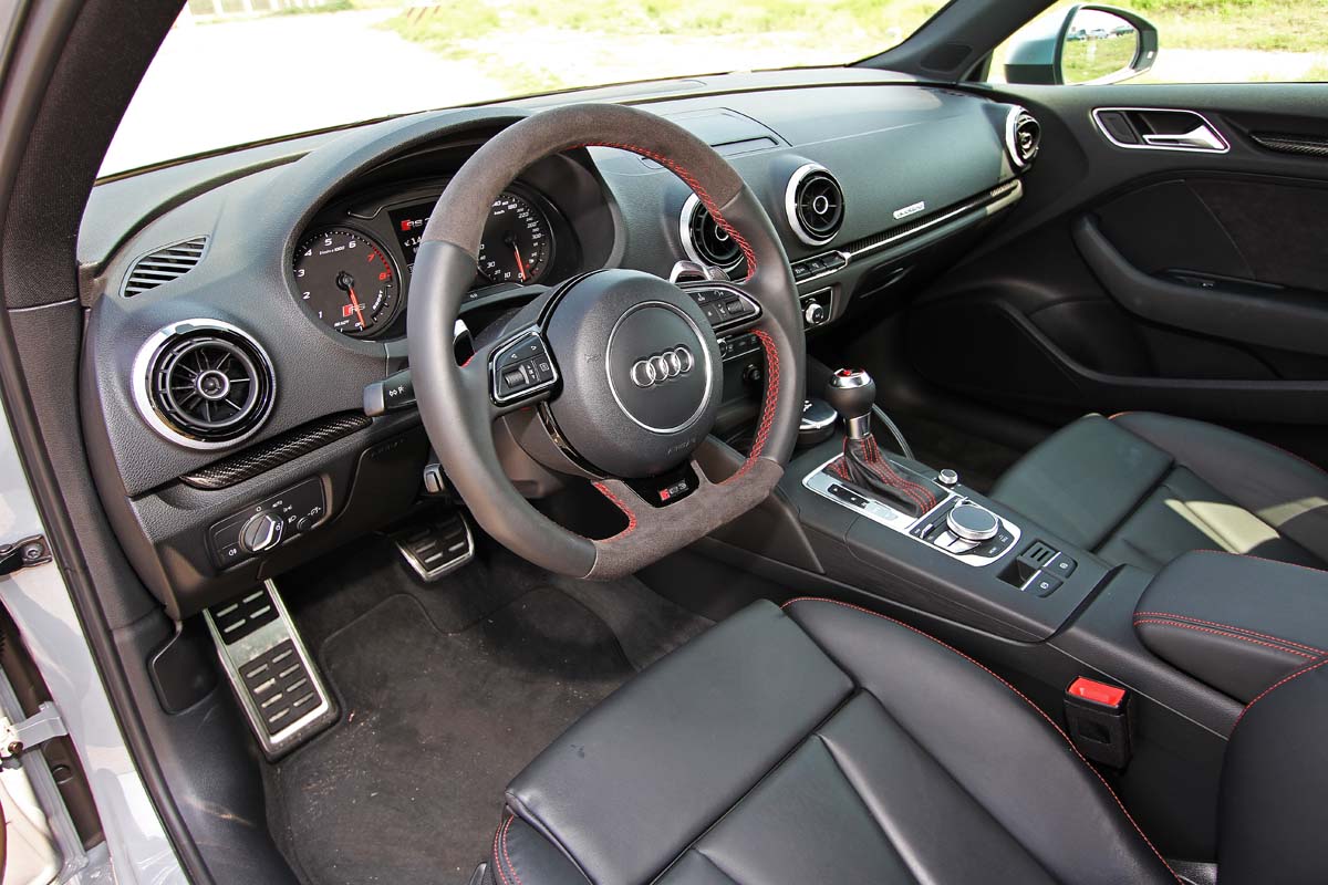 | RS3的內裝雖然與A3/S3採用相同的格局,不過包含方向盤、座椅與車門飾板部分,都改以更具競技感的麂皮與設計來取代,一上車就感到熱血沸騰起來。 |