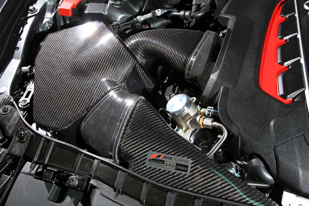 | 這組AWE碳纖維進氣套件,表現具有高質感的碳纖維紋路,為原廠已張力十足的引擎室,再增添不少性能氣息。 |