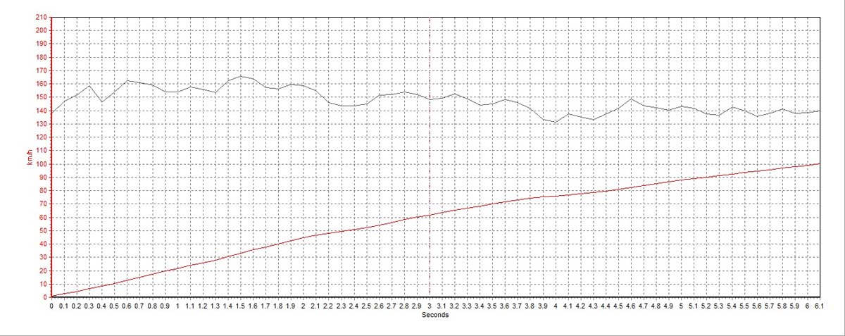 Km/h的加速測試,經過三趟測試,最佳一筆成績為6.2秒的時間,看似不快的紀錄卻由一部車重達1993kg與使用285mm寬胎的車輛所創造,認真想起來其實不慢,相較於原廠公佈的6.8秒數據,整體表現相當不俗,也代表UpRev對性能提升確實有所助益。