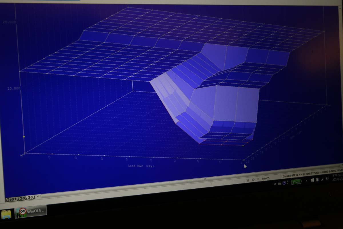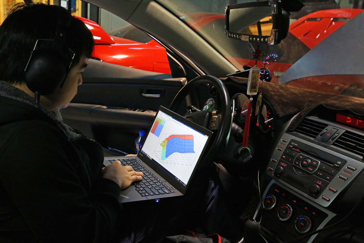 負責人陳豪表示目前到店內撰寫電腦的車款多半是新世代為主,而這些車都有一個相同特色,那就是為了讓車輛好開,可變正時系統都做得相當不錯,相較於供油、點火的設定,阿豪則是把撰寫的心力多半投入在可變系統的設定,利用可變系統搭配正時點火的配合,在Mustang馬力機上可以做出更細膩的修正,並且透過扭力曲線圖來找尋每輛車的最佳值,營造出絕佳平原扭力讓車輛擁有更好的加速性能,外掛渦輪車輛也可透過改變原廠電壓範圍,讓電腦正確的噴油無需擔心修正問題。