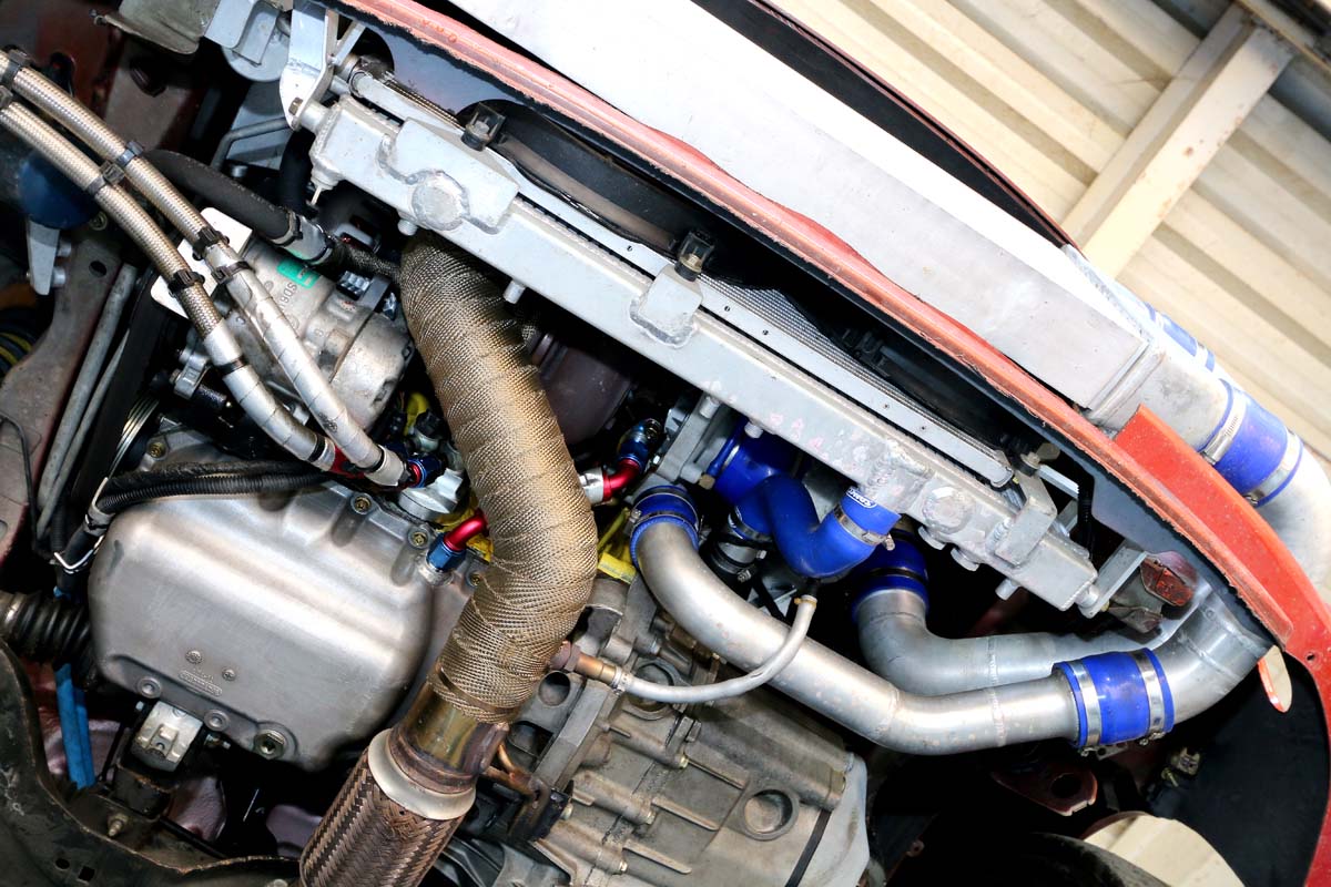 為了高耐久度,芭蕉部分也是直接向國外訂製鑄鐵材質,而下方的Precision渦輪機則是為了100-200km/h加速自行將葉片與排龜做了好多次的更換,為了降低中低速的扭力轉向,則是將渦輪大出設定在較晚的6000rpm,不過出力可持續到9000rpm,另外變速箱目前則是打算移植S16的小獅頭大本體來提升耐用度,搭配3-4檔強化直齒希望能做出個位數的加速成績。