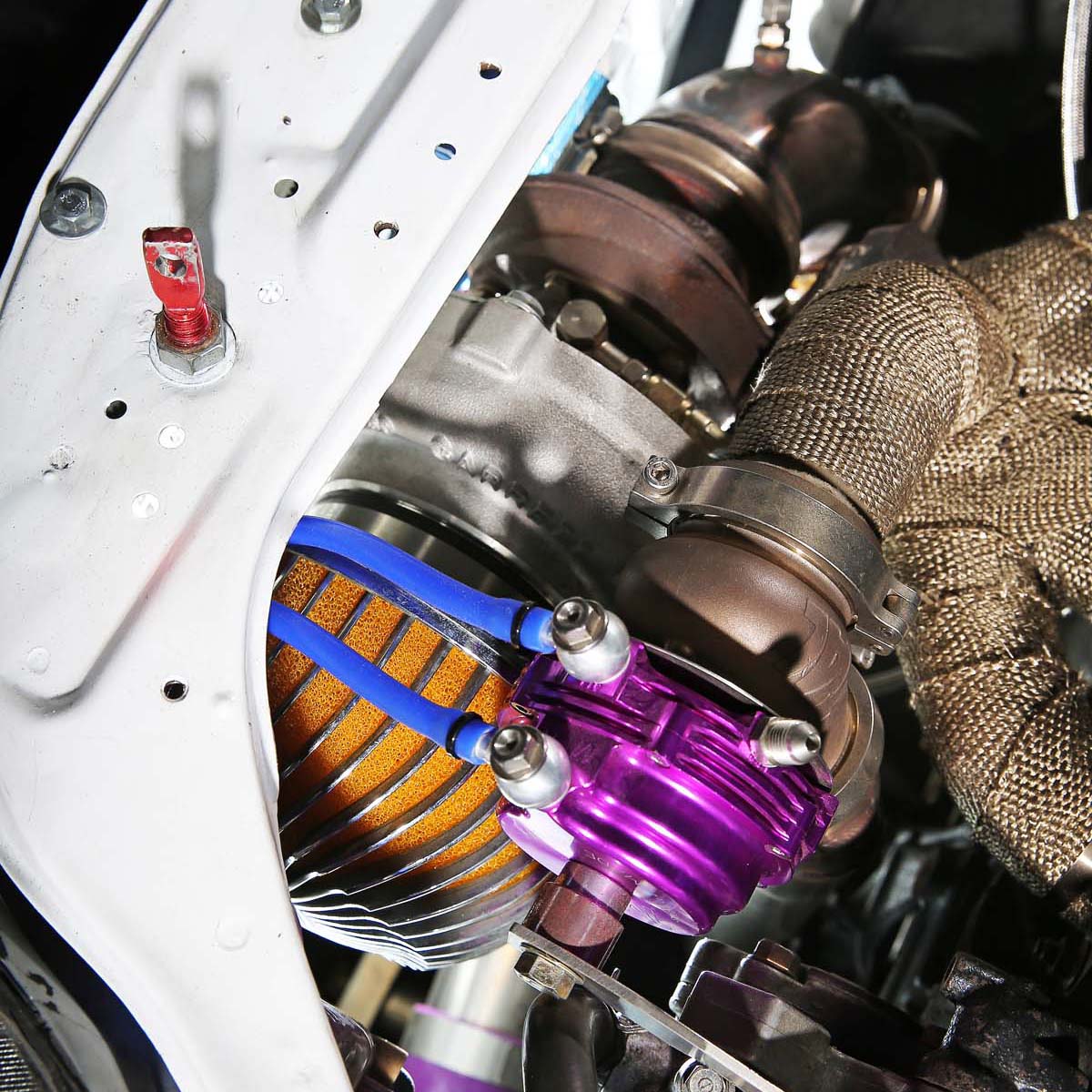 | 渦輪機採用上Garrett2835規格,並且施以誇張的2.2bar最大增壓值,也讓這顆單凸V引擎順利突破400hp的輪下輸出。 |