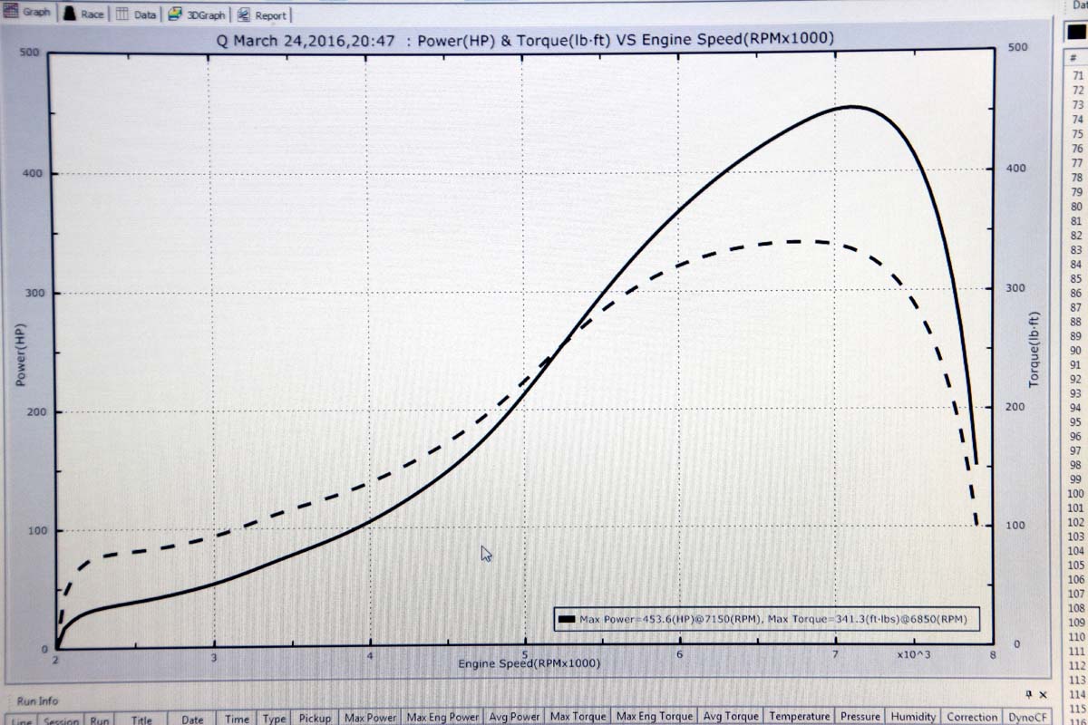 目前在HKS F-Con V Pro 3.3版本撰寫下,透過AVC-R將Garrett2835渦輪機最大增壓值設定在2.2bar,最終也在馬力上突破了單凸400hp魔咒,最大出力更是直上453.6hp,並且扭力更是誇張達到47.16kgm的境界,搭配上特製的3-4檔直齒,該車在3檔80km/h時就能達到全出力,將車輛瞬間加速到100km/h直衝200km/h。