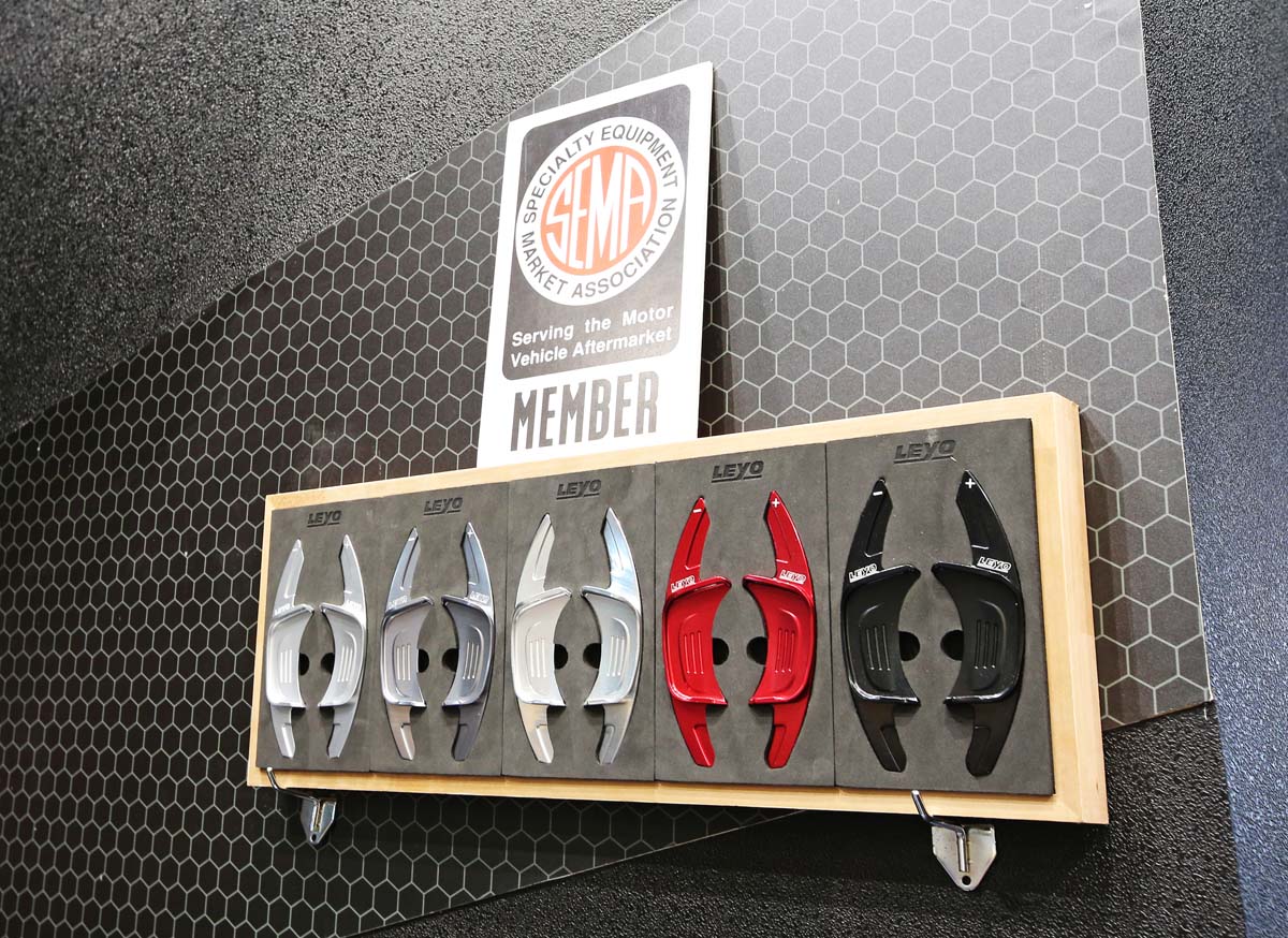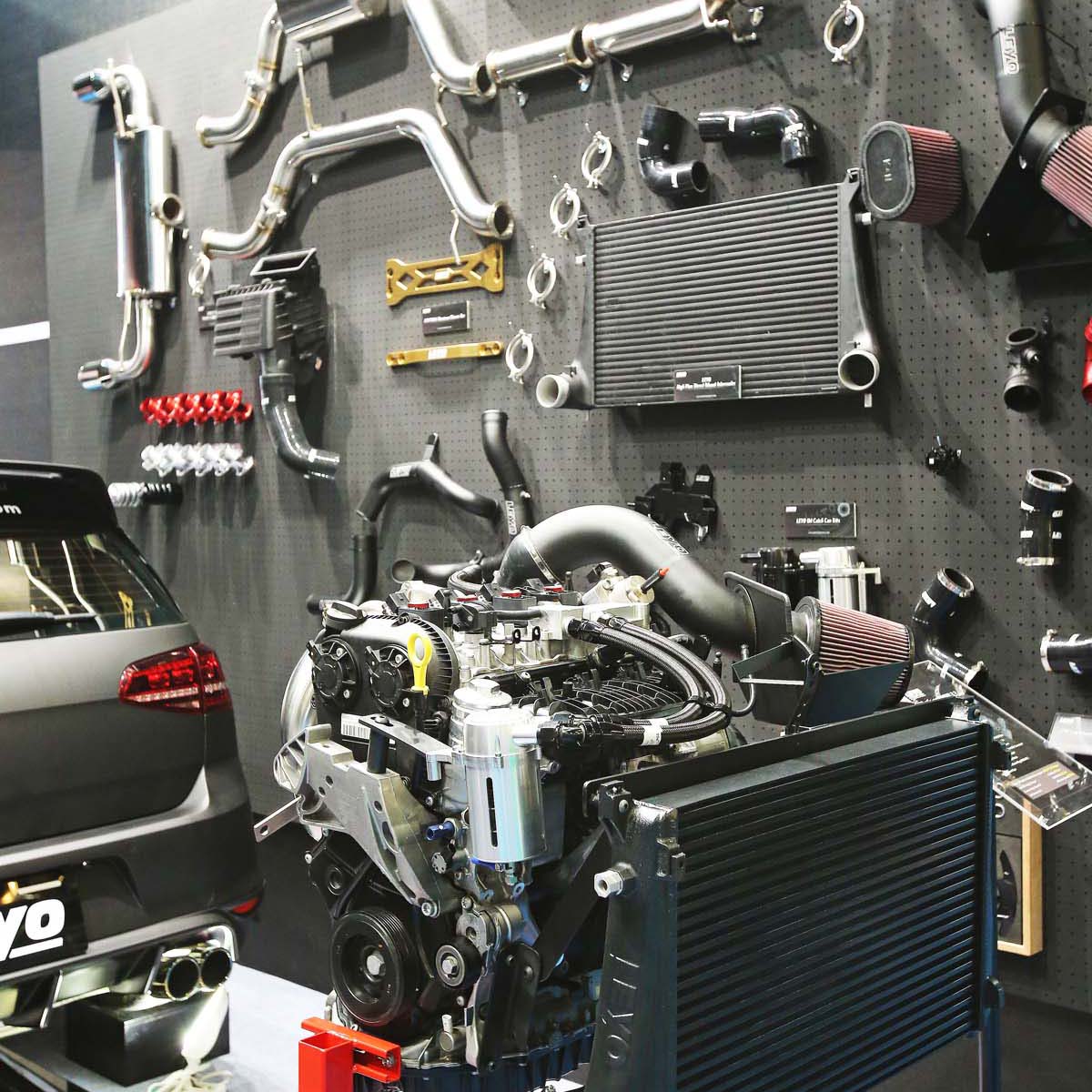 在花枝招展的展場中,有一個烏漆麻黑的攤位吸引到了筆者,「LEYO Motor Sport」這個品牌雖然總公司在洛杉磯,不過卻是一個來自台南小男生所打造的帝國,每年SEMA Show也都不缺席,將台灣高超的CNC技術透過品牌展現在國際間,其餘前置中冷器、強化矽膠管、排氣管、洩壓閥及副車台襯套所有東西都是MIT,目前LEYO Motor Sport則是有意在台灣設廠,絕對是VAG車友的一大福氣。