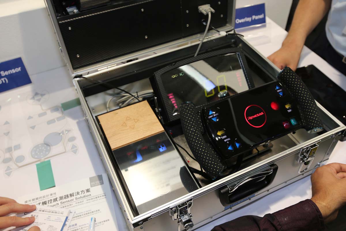 瑞薩是一個微控制器供應商,結合了微控制器、電源與類比半導體,像是攤位上所展示的電容式觸控感測器,可將開關整合至曲面或壓花表面,也可以嵌入10mm厚度的壓克力板或木質面板,簡單來說,就是可以隱藏於內裝飾板中,此觸控面板甚至具有防水功能,也就可以使用於車身外部,基本上就是未來汽車的概念。
