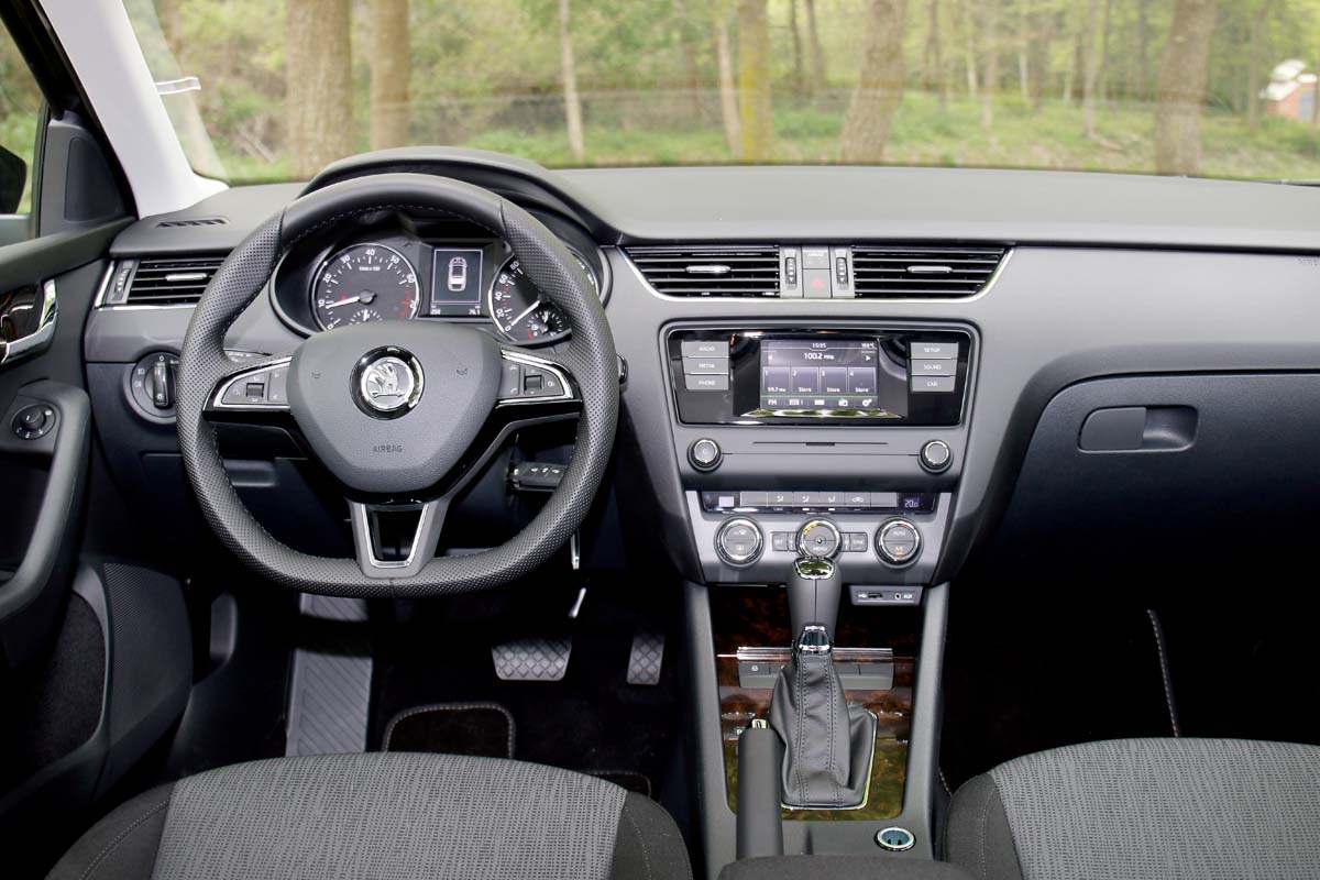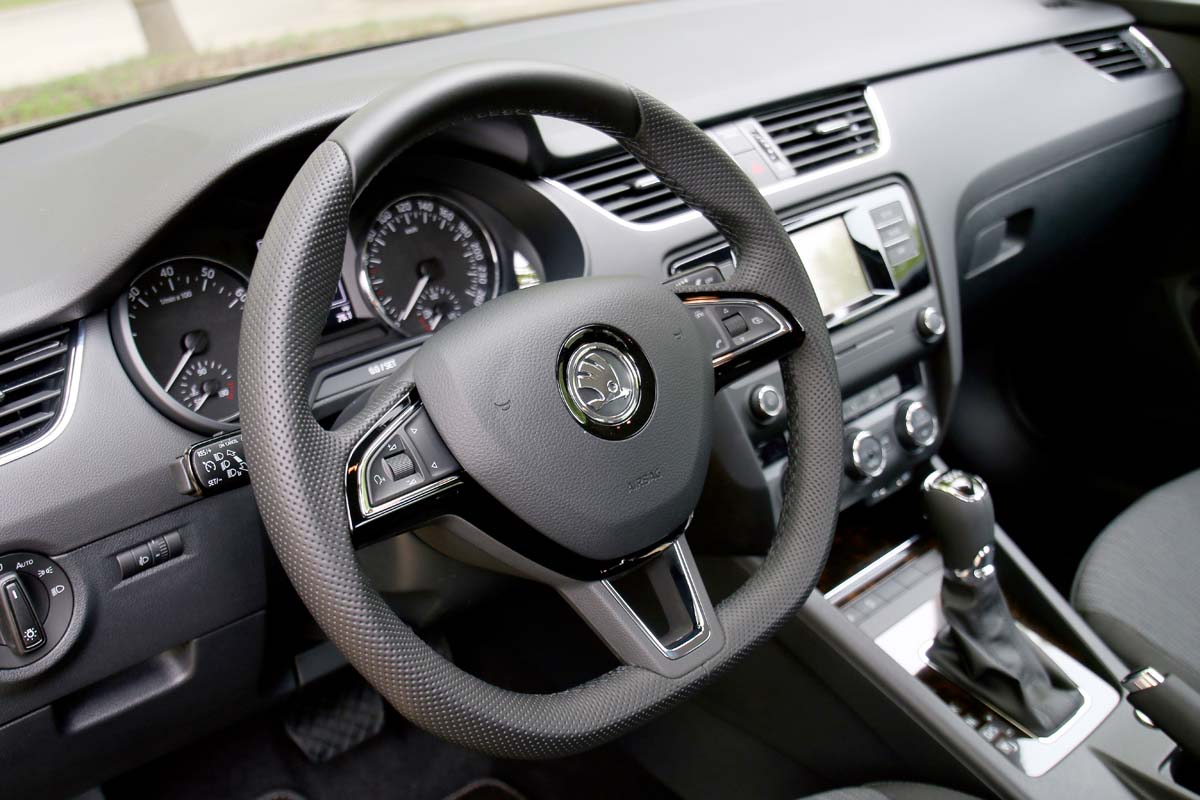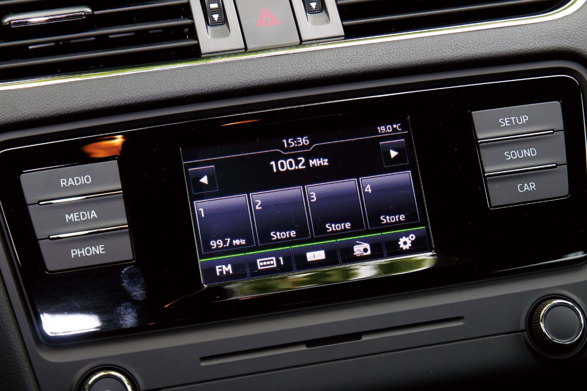 Octavia 1.4 TSI的內裝設計仍維持不變,同樣展現出Skoda一貫的簡潔與穩重風格,且透過軟質塑料、木紋飾板以及鍍鉻飾條的鋪陳,為車艙帶來精緻高質感的氛圍,儘管未採真皮包覆的座椅少了些高級感,但布織座椅所表現出的出色乘坐感與包覆性卻贏得了好感。在配備上,以其90萬級距的價格來看,算是水準表現,雖然安全性配備相當豐富齊全,但在其他豪華舒適配備上,仍看得出其「入門定位」,包括頭燈仍採傳統的鹵素頭燈照明燈源,且電動天窗(NT$45,000)、AFS主動轉向氙氣頭燈與LED晝行燈(NT$55,000)等皆需加價選配,不過標配的5吋MLB多媒體資訊娛樂系統,則可支援數位影音娛樂、藍牙連結以及節能資訊與各項行車電腦等顯示,功能性相當強大,唯未能支援中文系統為一小缺憾。另外,原廠也提供具備Smart Link智慧型連結功能的6.5吋彩色觸控MLB多媒體娛樂系統供選配,只不過買家得多支付NT$9,000選購。