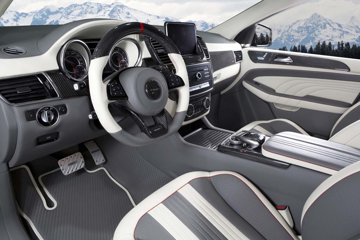 接下來就是底盤部分,鋁圈改裝Mansory旗下全新的Spider系列製品,23吋的尺寸寬度更達11J,輪胎則是搭配低扁平比的305/35 R23規格,好啦!龜也暴了、鋁圈也變大變寬了,車高部分呢?Mansory提供氣壓式避震器模組,可降低30mm的車高,看起來更殺、開起來更穩。Mansory為動力部分改裝了進排氣強化系統,也提供ECU改寫程式,最終使GLE Coupe最大馬力到達829hp,最大扭力更高達117.3kgm,極速則是可以增加45km/h左右;至於內裝部分,可以量身訂製皮革與顏色,也可另外搭配碳纖維飾板,而踏板與腳踏墊也都在客製化服務內。
