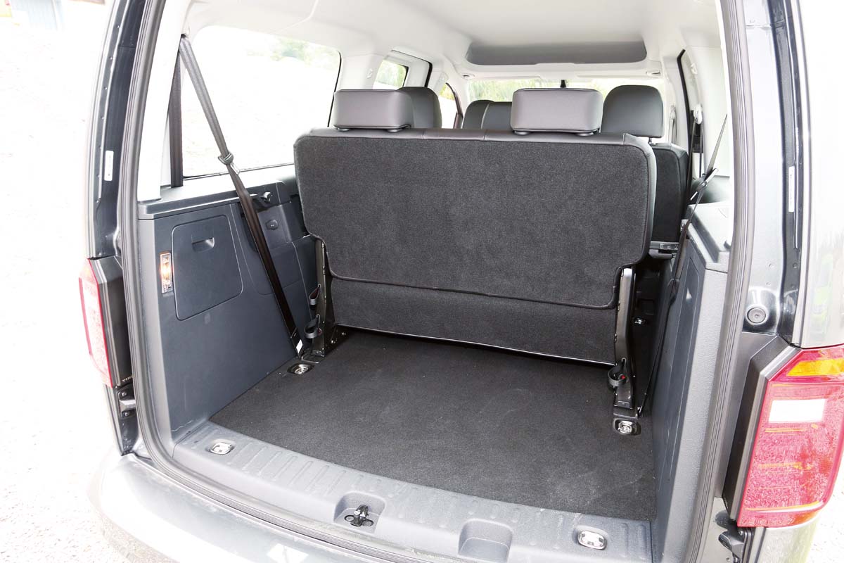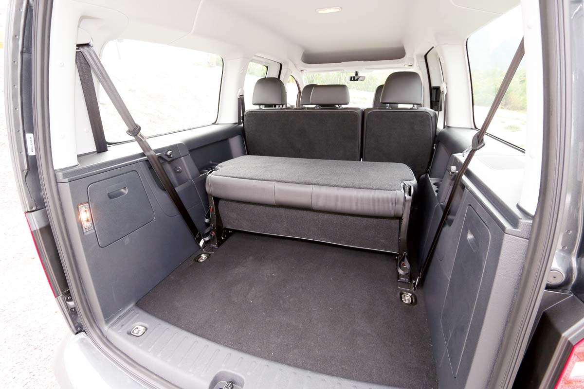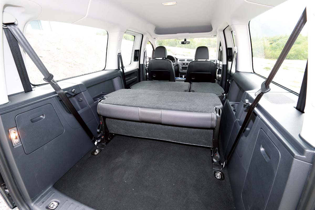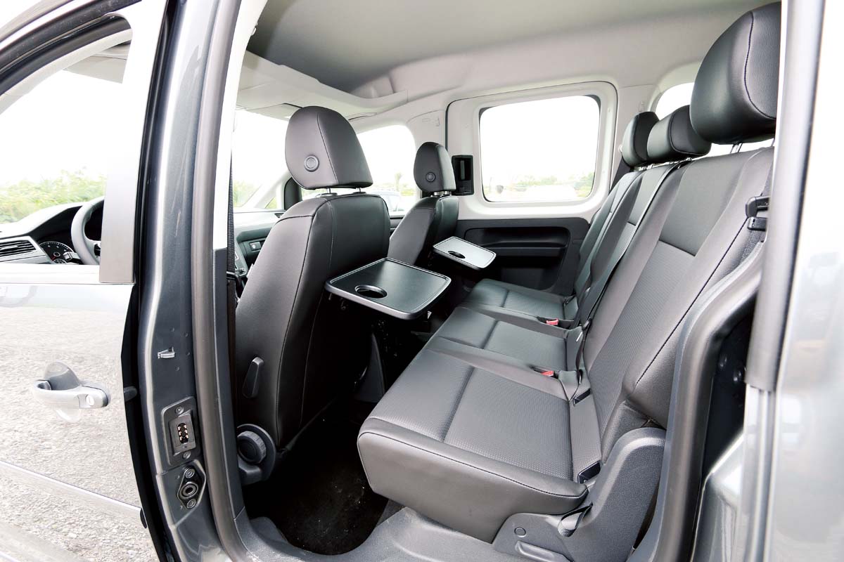 採3排7人座設定的Caddy Maxi,車身長/寬/高4878/ 1793/1868mm、軸距為3006mm,從這數據不難得知其車室空間的寬敞程度。不過此車最厲害之處就是乘載空間的變化機能性,藉由可拆卸的第2、3排座椅設計,可讓車主根據需求於7/5/4/3/2人座等進行乘載調整。而藉由座椅變化也讓行李廂容積從標準的530L提昇至1350L,甚至是全平面行李廂底板的3880L超大空間。此外,更設計有便利的折疊小餐桌,再加上後座出風口、大大小小的儲物收納空間與9個置杯架,完全是休旅車才有的配置設計。