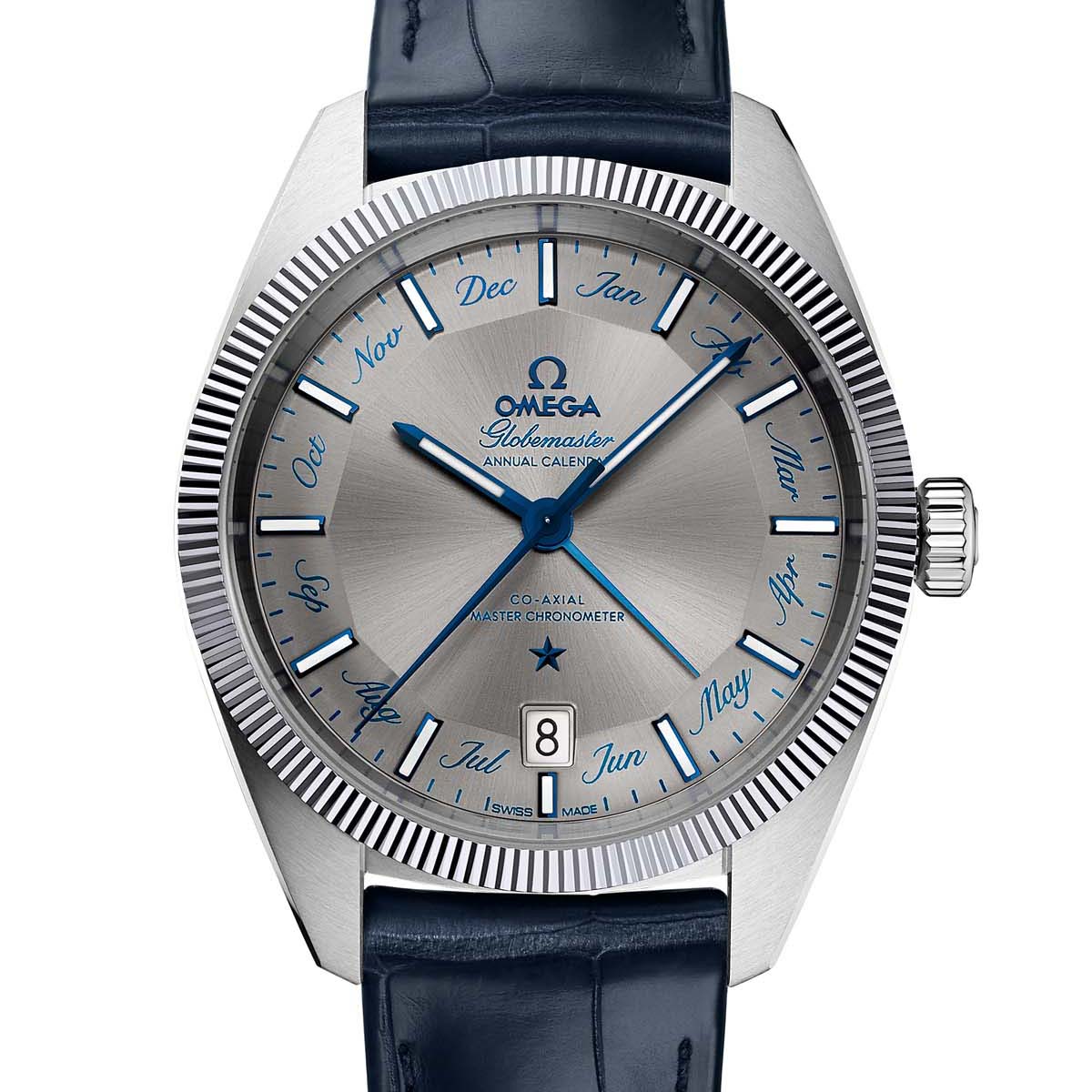 歐米茄(Omega)這幾年的腕錶風格不若過往的陽剛,反而多了許多細膩人文味。去年發表了Globemaster後,今年也結合年曆功能,讓Globemaster家族再添一枚新生力軍。它的造型依舊延續過去該系列的傳統「多邊型面盤」(Pie-Pan Dial),並於12個時標間以草寫標出月份。且搭配近兩年蔚為風潮的藍色風格,十分搶眼。