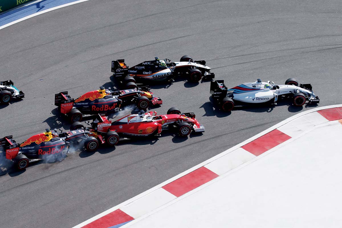 | 俄羅斯站地主車手Kvyat起跑再次追撞Vettel,且這次撞好撞滿──直接把他撞上牆去。 |