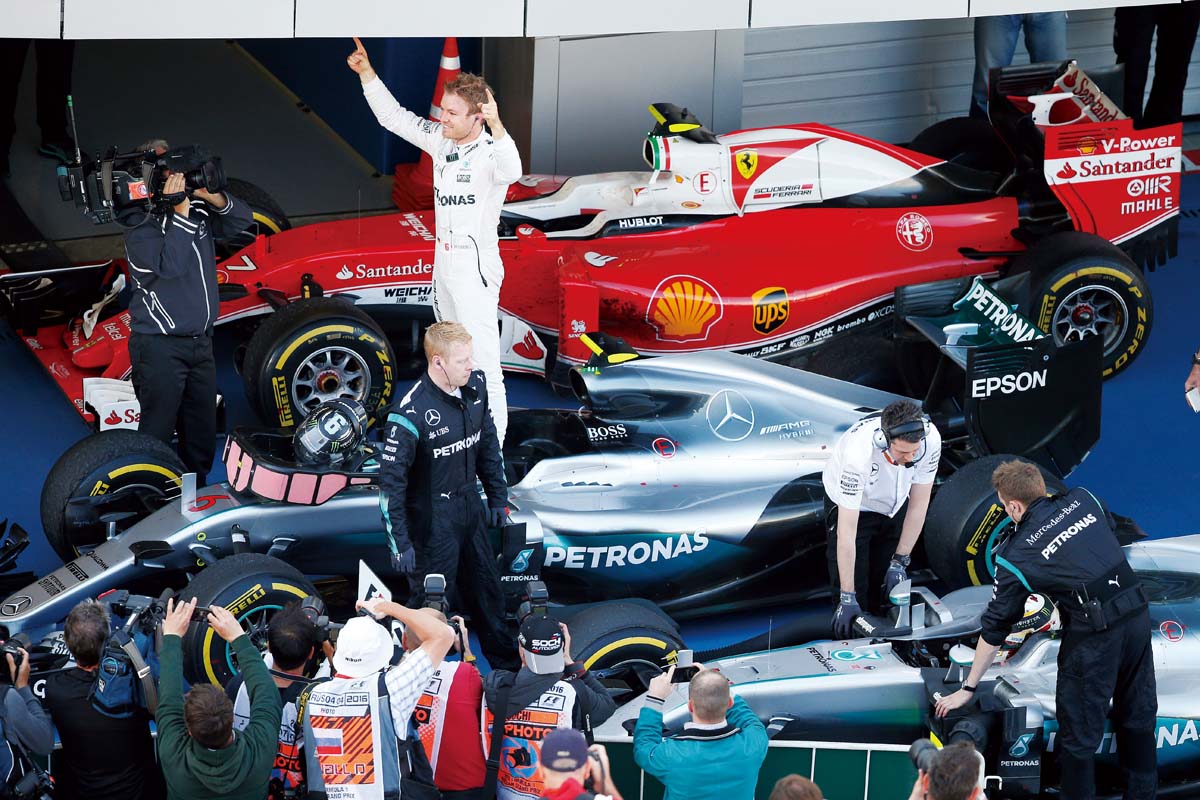 本站一起跑,Lewis Hamilton再度失利、讓Nico Rosberg超了過去,心急的他當然想要儘快反超,而Rosberg調錯了供油模式、致使車速慢了下來──據Hamilton所言,約比他慢了17km/h──他當然機不可失、出手進攻,Rosberg一路往內側阻擋、逼到Hamilton上了內側的草地,結果他就在草地上打滑失控、然後撞到隊友!頭半圈還沒跑完,勝利當如囊中物的兩部Mercedes已經灰飛煙滅,這當然不是他倆首次相撞,但卻是首次雙雙退賽,以他們這兩年劍拔弩張的態勢來看,大家都覺得這場面遲早要發生,只是一旦真的發生了,仍然覺得很轟動。