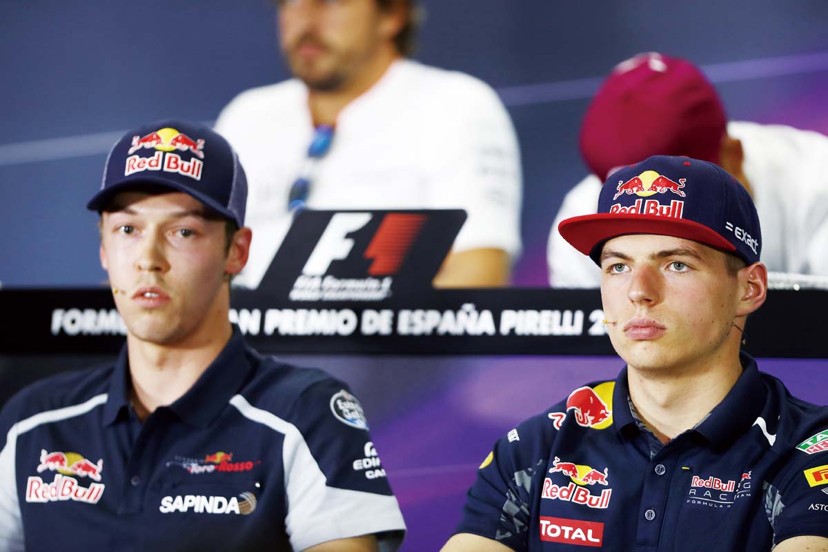 | Verstappen(右)和Kvyat(左)互換席位後的首站比賽,FIA還刻意在賽前記者會安排他倆比肩而坐…. |