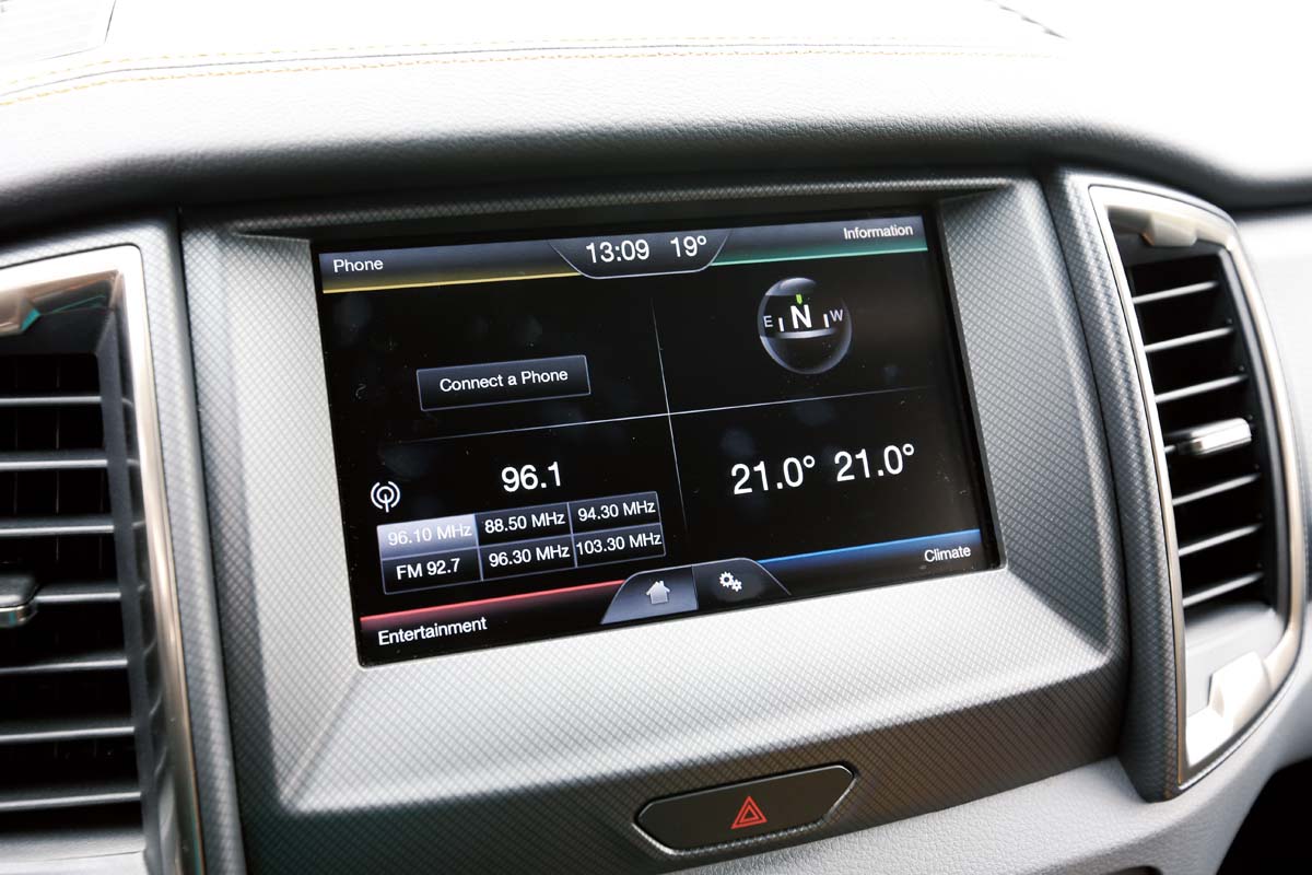 除了外觀上的變革外,小改Ranger於座艙方面也朝時尚氛圍看齊,其調整幅度甚至比外觀來得更為明顯。座艙之所以能有如此明顯變革,首先當然便是整體格局線條更為筆直,進而讓視覺感受更加清爽,除此之外,中控系統的升級與空調介面改變亦是功臣之一。這次小改Ranger換上全新八吋觸控螢幕系統,系統也升級至SYNC 2,除保有原先藍牙、音樂與車輛資訊等功能外,語音聲控部分也進行優化改良,此外,SYNC 2更加載緊急援助通訊系統,能於發生事故意外時提供救援功能。同時,儀錶板部分也換成與現行Mondeo相同的數位液晶介面,駕駛可針對車輛資訊與音源、通訊等需求進行介面切換,擁有較以往更豐富便利的使用感受。除上述配備之外還新增電子式差速器鎖定、胎壓偵測、倒車顯影輔助等系統。