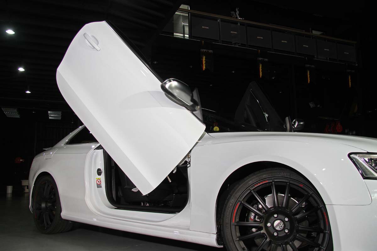 | 改裝明細:RS5前保桿、RS5後保桿、RS5左右側裙、RS5行李廂蓋、RS5電動尾翼開關、LSD-Doors鍘刀式車門、MTM M-Cantronic外掛電腦、MTM高性能輕量化20吋鋁圈、米其林255/30ZR20 Pilot Sport輪胎。 |