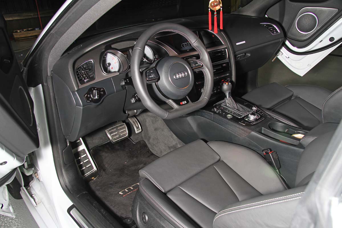 事實上,此車除了動力大幅強化外,整個外觀與內裝都朝向RS5化來進行改造,為了實現其改造計畫,瑪雅國際首先引進全套RS5的原廠套件,車頭部分由於RS5的前保桿與S5的前葉子板無法完全相容,因此需透過後續的修改才能裝上,而這樣的情況同樣發生在後保桿部分,而排氣管則透過尾管角度的燒焊修改,以對應RS5的尾飾管造型;至於左右側裙,則同樣透過鬼斧神工的烤漆補土技術,將其與門檻及後葉子板融合在一起,即使仔細觀察亦很難找出破綻。