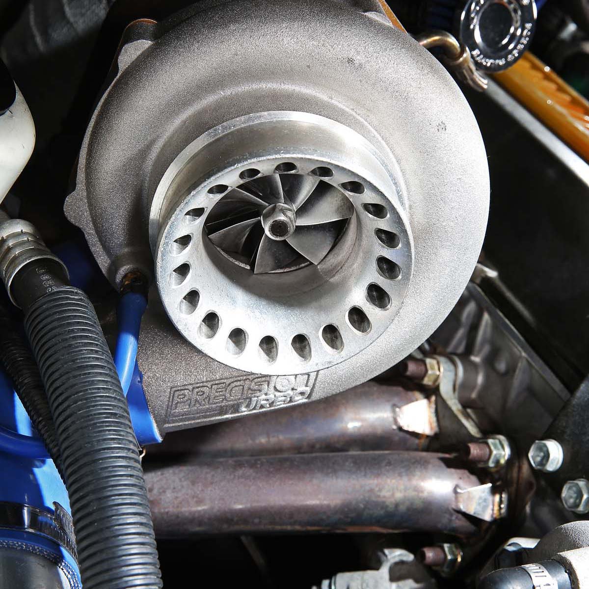| 美國製的Precision 6466 Gen2渦輪機,進氣道上的開孔就是所謂的二次進氣,空氣會透過開孔導入葉片下方的溝槽來輔助葉片轉動,這樣的設計有助於高出風量渦輪降低渦輪遲滯所衍生出來的系統,加上進排龜與中座都是Precision自製,算是目前人氣相當高的渦輪機。 |