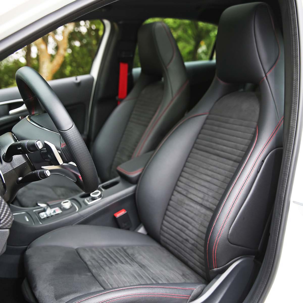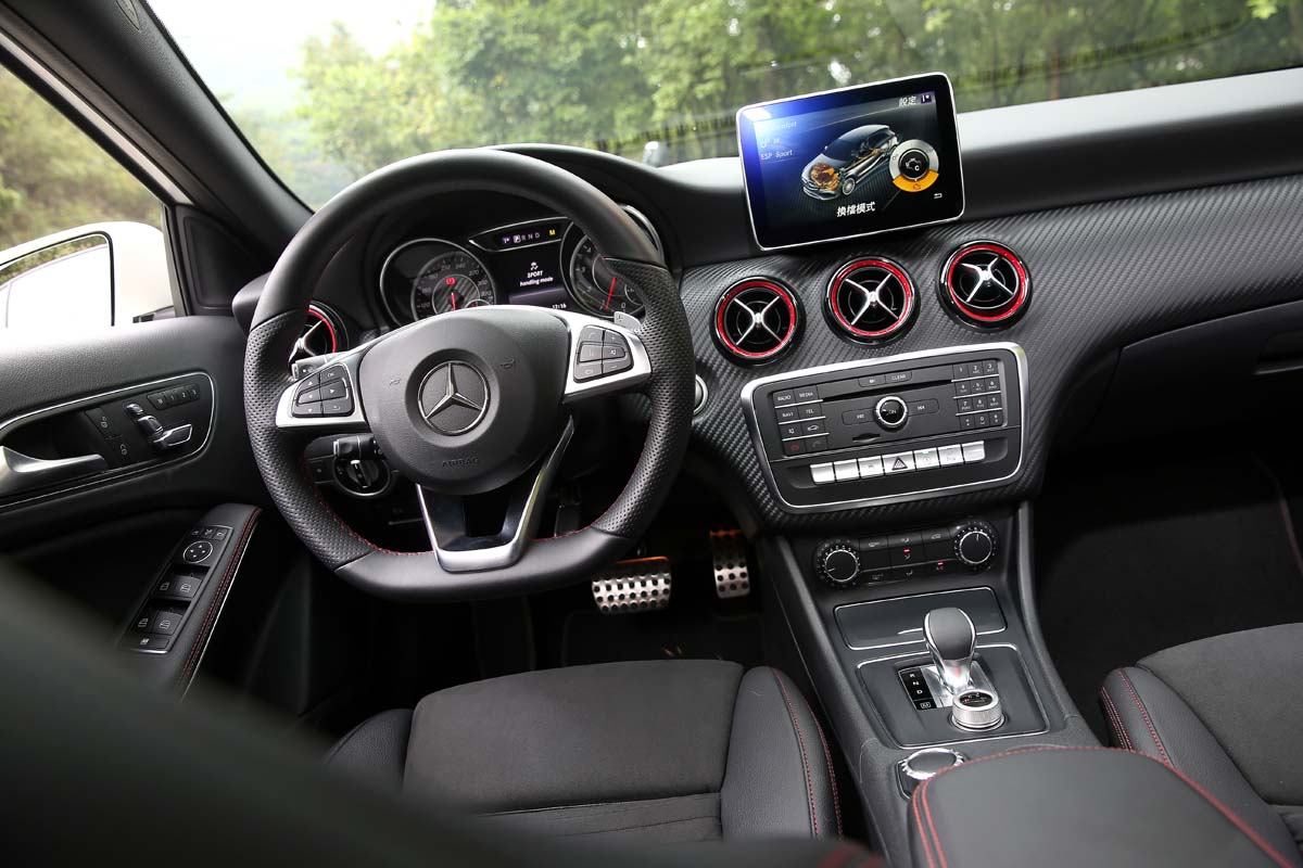 | 內裝配置與一般A-Class大同小異,碳纖維內飾板及紅色Line冷氣出風口,與車內紅色縫線做搭配,營造出更加熱血的駕駛氣氛。 |