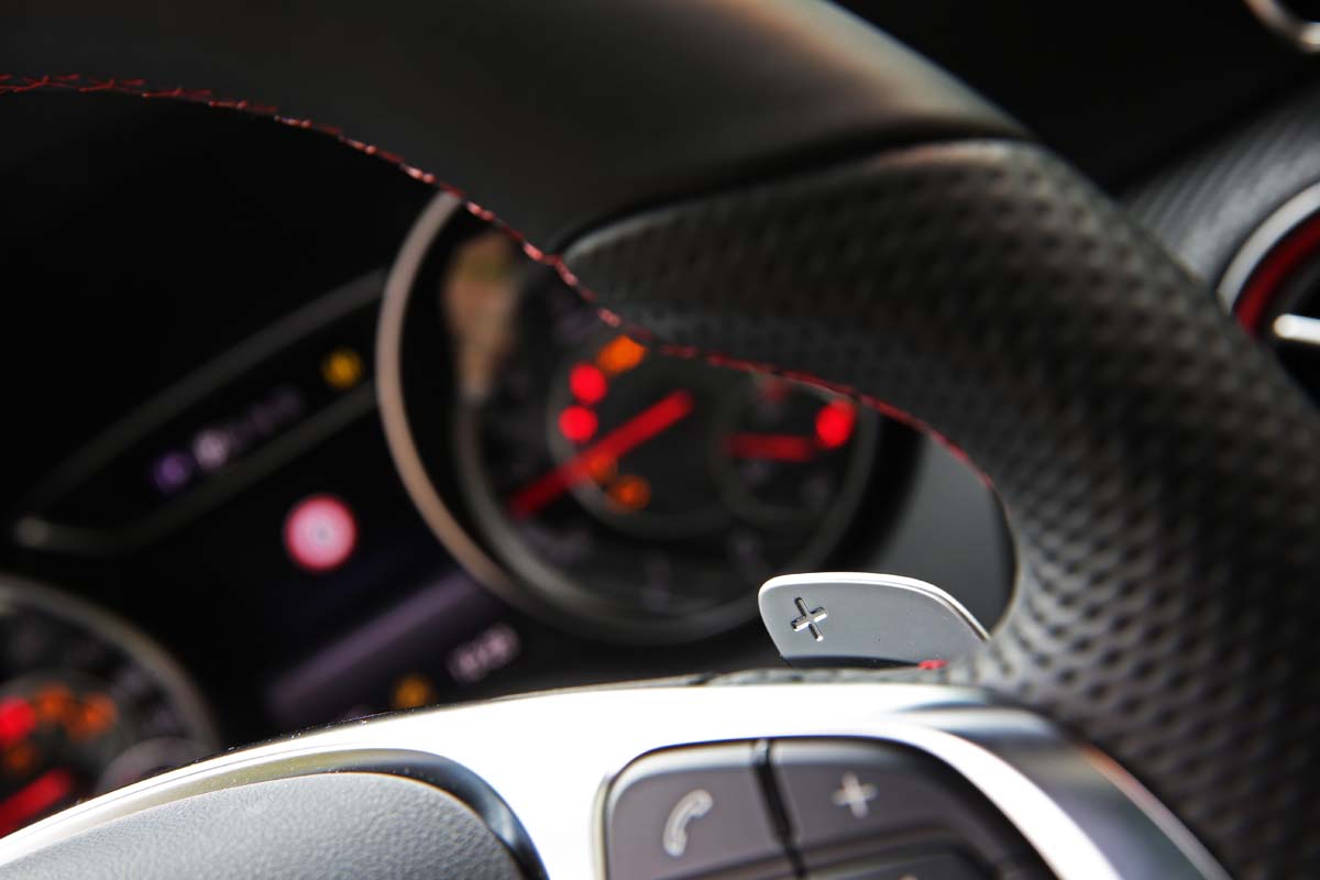 | 換檔撥片採用與方向盤連動設計,當然有人還是習慣撥片採用固定位置較不容錯亂,不過其實A45方向盤左右僅2圈的設計,幾乎沒有這個問題發生。 |