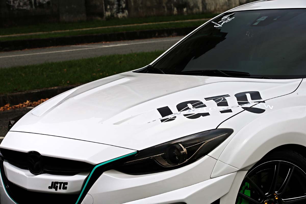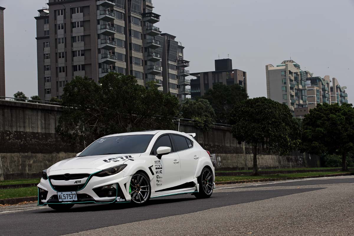 擁有猛男般的結實肌肉,其所展現出的力與美,不僅輕鬆營造出難以抗拒的動感,就算套用在市售房車上還是一樣迷人與吸睛,隨著全球所興起的寬體爆龜式樣再度成為改裝車迷所矚目的焦點,為了搭上這股旋風熱潮,同時又不希望只有千萬超跑才能升級爆龜,因此專注於空力套件開發的台灣JGTC,特別著手針對目前改裝市場上相當夯的All New Mazda 3接連推出專屬升級套件,然而才在去年底正式亮相的16件式組裝空力套件,由於有別於一般傳統空力套件採用直接替換的升級方式,在保留原有外觀的基礎下,透過額外增加小配件的組合方式進一步達成造型上的改變。