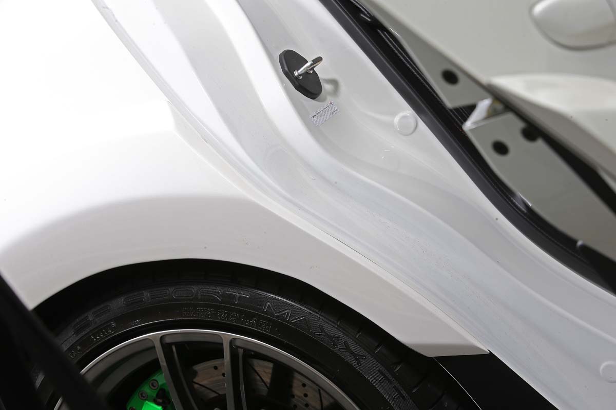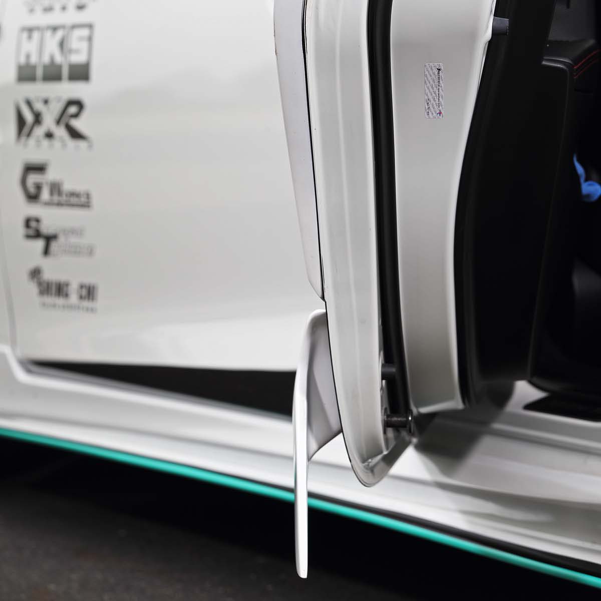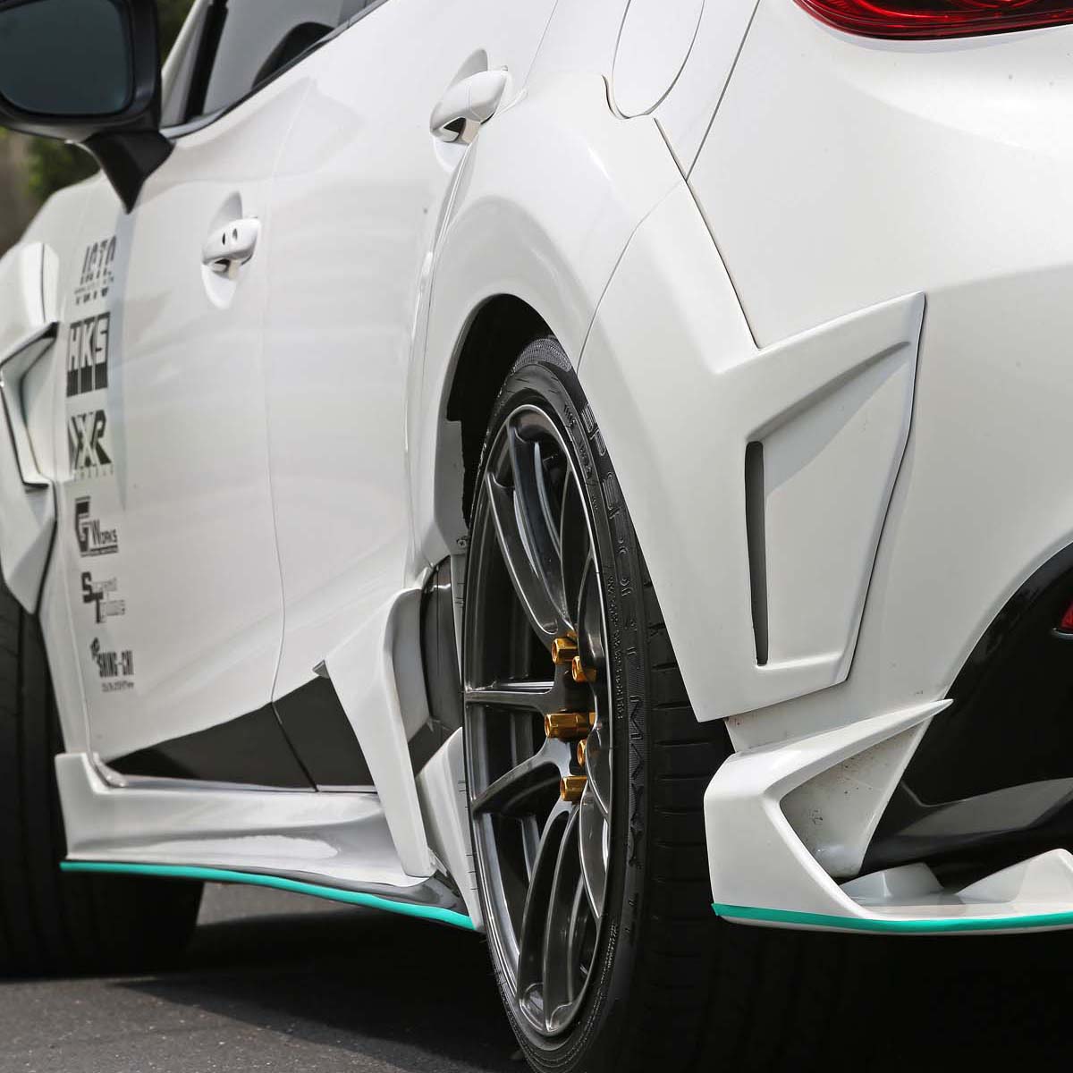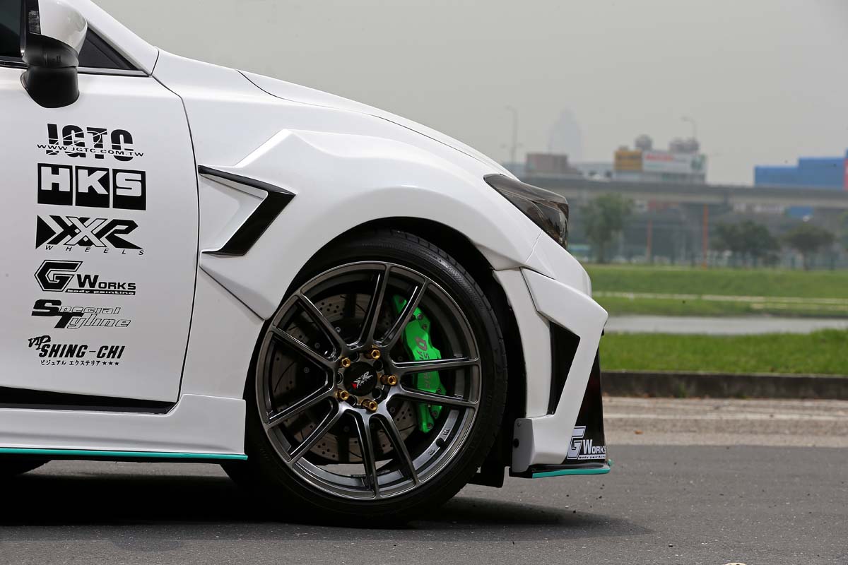 只不過這麼新又有型的日系轎跑車,真要動刀對車身鈑件進行切割破壞,全台肯定只有幾個瘋狂車主會不計代價改下去,雖然寬體真的很帥,但是無法真正受到消費者青睞的改裝套件還是看看就好,考量到現實需求面,現行法規已針對外加爆龜採用更為嚴格的驗車標準,只要不是原廠外觀就會立刻打槍,必須恢復原狀才能驗車,為此台灣JGTC著手依照前後葉子板的線條,加上已組裝上的空力套件而開發20件黏貼式爆龜,這樣一來不僅不需要破壞車體,同時也能減少施工難度與時間,只需5個小時不必切割車台直接創造微寬體的視覺感,驗車時可輕鬆還原。