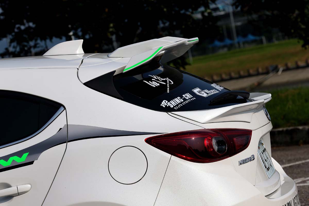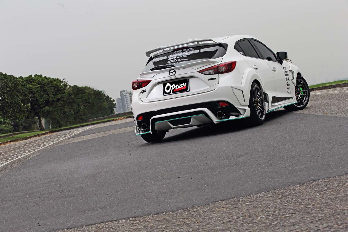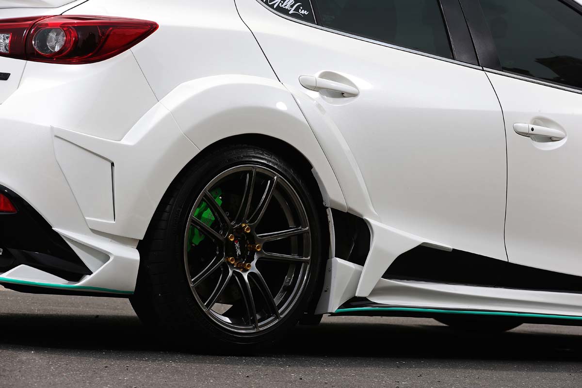 不論前下擾流、垂直翼與後下分流器等線條與造型搭配,所能夠發揮出前所未有的視覺效果,不管從什麼角度看都相當強烈,這也令人在當時留下極為深刻的印象,雖然堪稱相當大的設計改變與突破,但是這卻只是台灣JGTC當時的第一階段升級,因為只要沒有像樣的寬體加持就是不夠帥,畢竟大面積的車側單只靠腰線或側裙等裝飾仍有瓶頸,既然知道不足之處當然就要補強才算完整,然而經過近半年的設計與開發,如今彷彿化身成為鋼砲的Mazda 3也有了第二階段進化,透過重新設計的微寬體一口氣補強車側線條的不足。