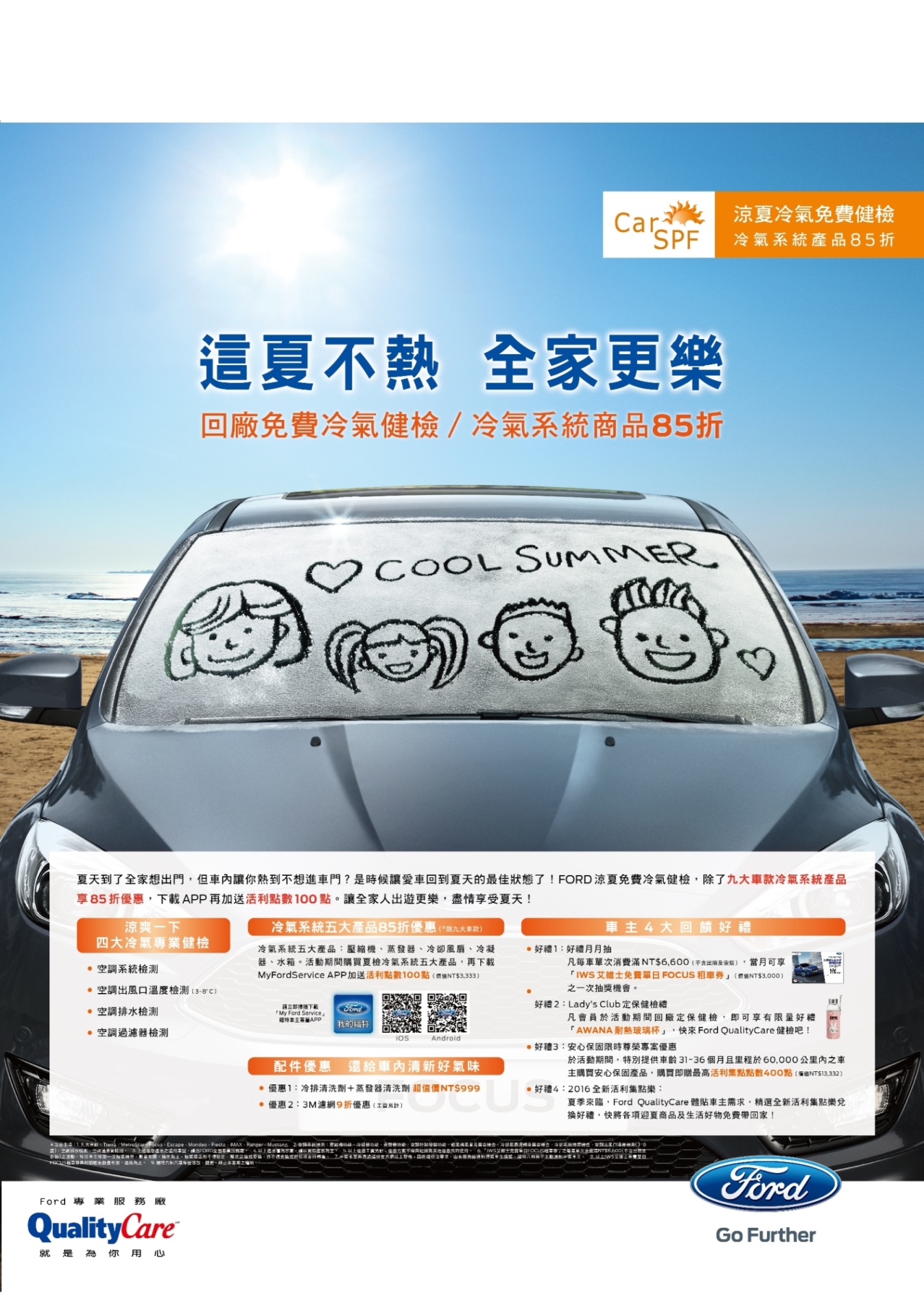 Ford QualityCare「這夏不熱,全家更樂」涼夏冷氣免費健檢活動,邀請車主回廠進行四大冷氣系統專業健檢服務,檢測項目含蓋了空調系統、出風口溫度、排水系統和過濾器檢測,以確保愛車冷氣系統處於最佳狀態,讓車主盡享清爽無憂夏日。除此之外,Ford QualityCare亦同時推出限定車型冷氣系統相關產品85折優惠活動註1,其中包括了壓縮機、蒸發器、冷卻風扇、冷凝器、水箱五大產品,車主下載MyFordService APP,可再加送活利點數100點(價值NT$3,333)。