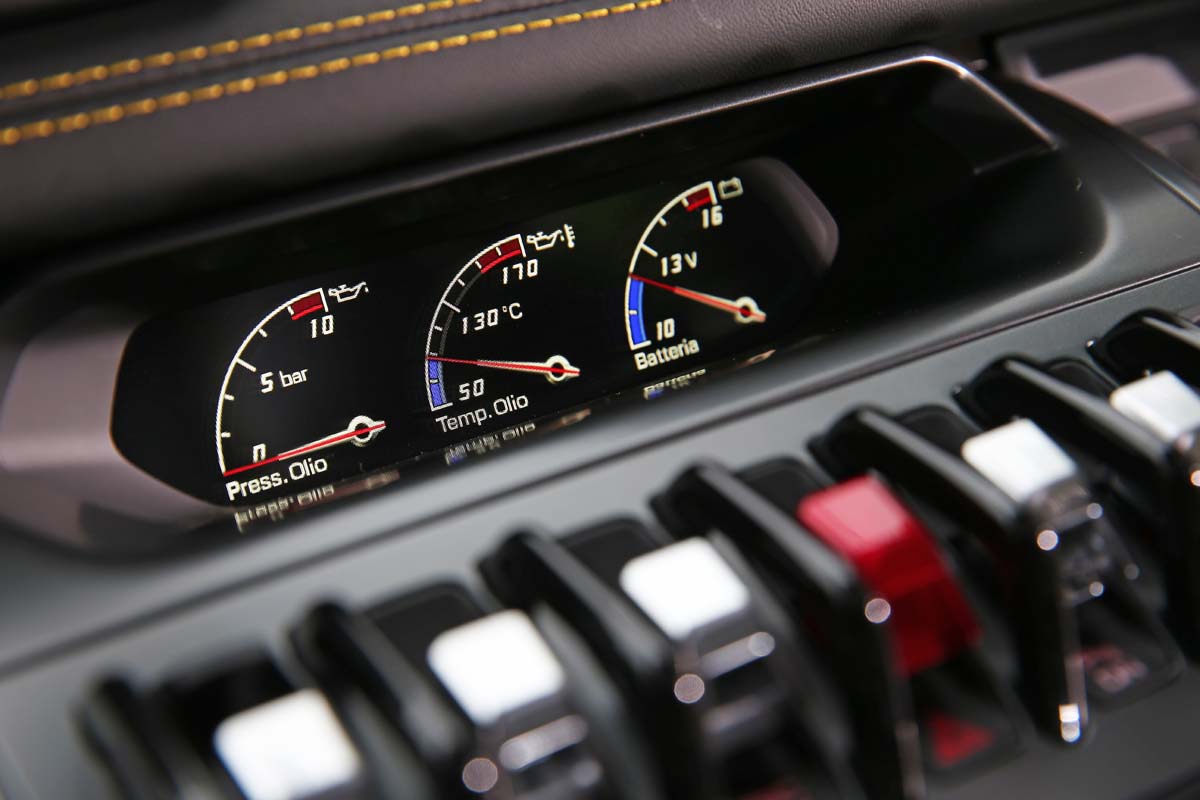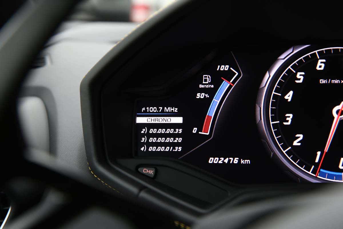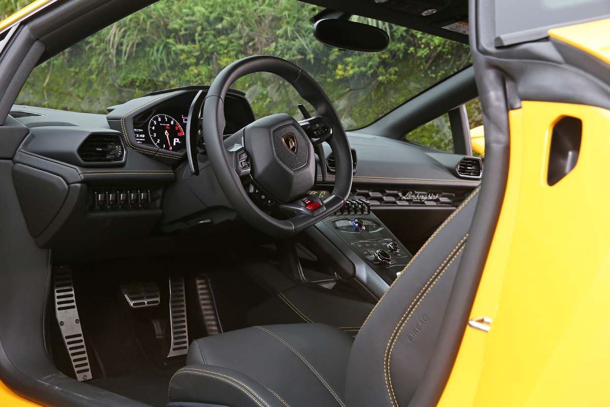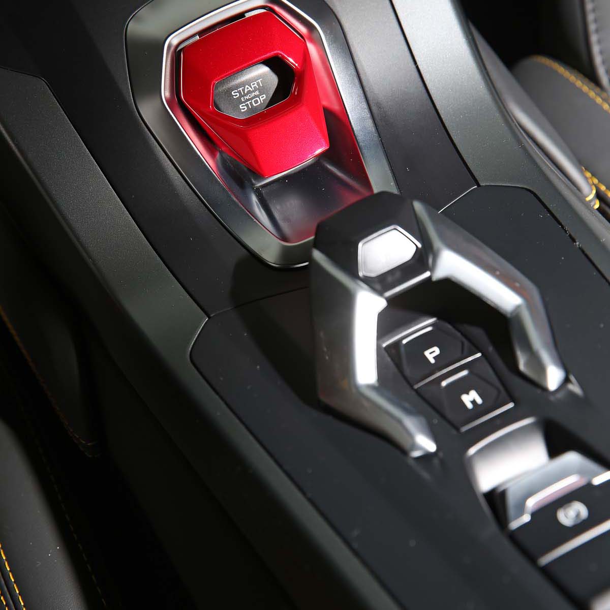 這輛車其實選配的東西並不多,除了特殊的塗裝、皮革縫線及前輪抬頭之外,另外LMR主動式懸吊則是並沒有納入今日試乘車中,不過就算沒選配LMR其表現依舊是令筆者感到驚艷萬分,扳起中央扶手上的紅色防意外觸控裝置,點燃位於座位後方的V10引擎轟轟作響,Engine Start下方的R、P、M按鈕就是排檔桿了,方向盤後方鋁合金切削出來換檔撥桿無論在何種檔位下都可強制切換檔位。