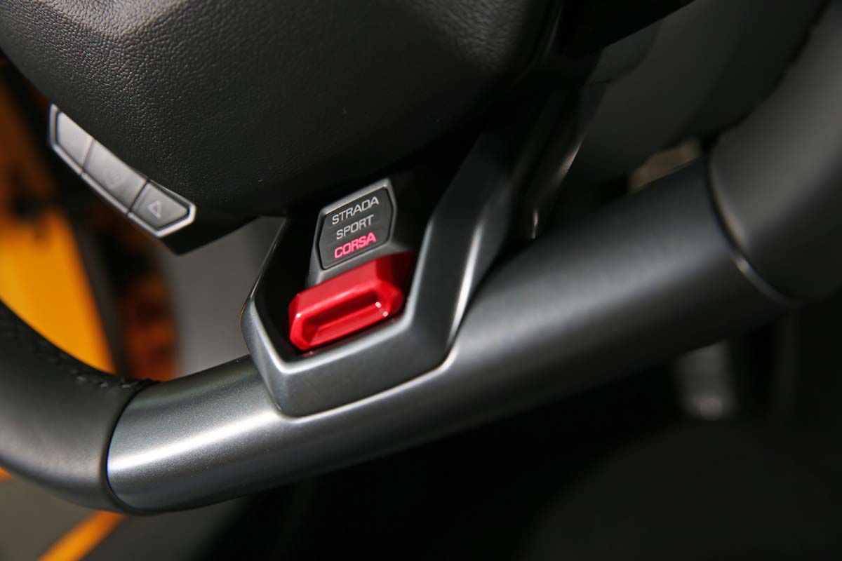 | 方向盤最下方的鋼鐵人紅撥鈕提供模式切換使用,「Strada」普通街道使用,「Sport!運動取向可容許車尾更大的滑移動作,「Corsa」則是沒有任何防滑介入,並且排氣聲浪會變得相當狂暴,回油時排氣管也會有相當震撼的蹦蹦聲響。 |