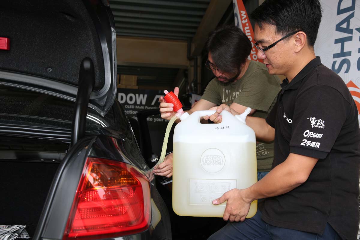| 將舊油抽乾後,再加入15公升的另一款待測試的汽油,希望能以較多的容量來稀釋油箱內的一點點舊油,同時確保汽油泵浦能吸得到油,讓測試結果更加客觀。 |