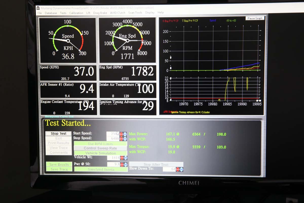 至於馬力測試方式,則是每款汽油測試三趟,取表現最平均的一趟,如果三趟測試下來的數據誤差過大,則會加測一趟,藉此獲得更客觀的數據。而每款汽油測試前,都會讓車輛與馬力機有充分休息與冷卻時間,馬力機與測試車輛全程都會使用強力風扇吹拂散熱,並且等待引擎水溫降至攝氏92度,進氣溫降至38度左右,才會開始進行另一款汽油的測試,以減少測試儀器與車輛因熱衰竭所產生的測試誤差。且好在兩天的測試過程中,彰化地區的氣候都是陰天,氣溫大約都在27~28度左右,不用擔心不同氣溫對引擎效能造成的影響。