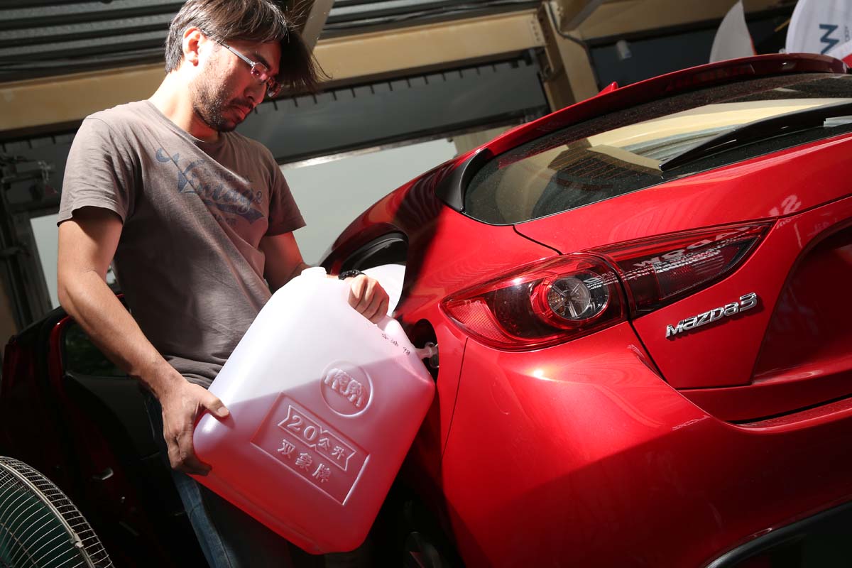 | 將測試完的汽油抽乾後,待測的汽油為安全起見,則是從加油孔加入,每次都會加入15公升的汽油,以較多的汽油量來稀釋油箱內殘留的一點點舊汽油。 |