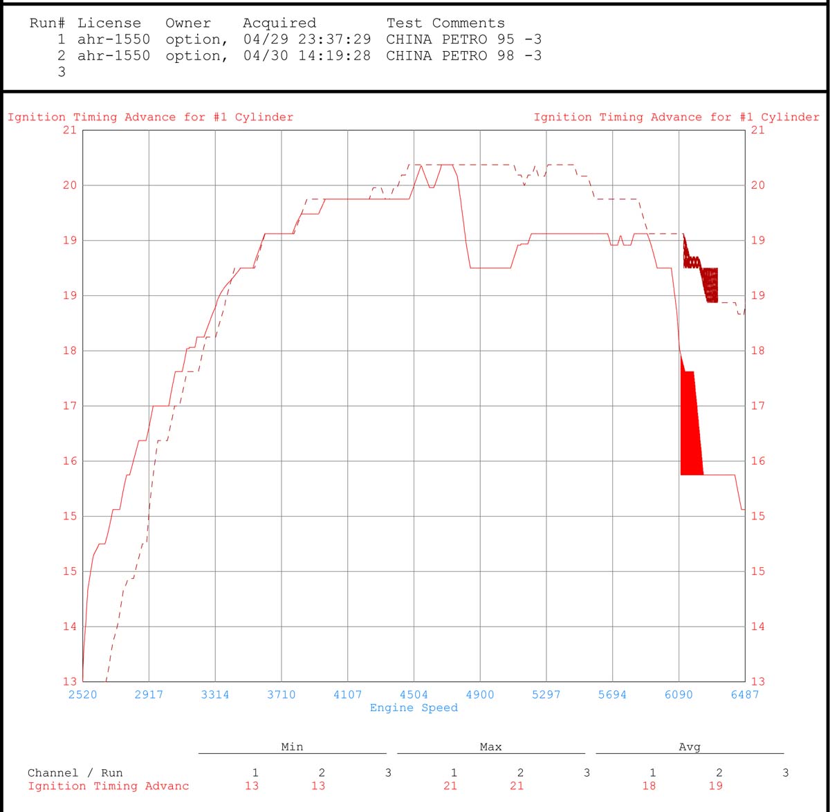 至於點火正時部分,實線同樣是中油95、虛線為中油98,兩者對點火正時的影響在低轉速時並不明顯,互有差異,不過待轉速超過4900rpm之後,兩者間的差距就顯而易見,只見中油95汽油的點火時間一下子從原本的20.8度左右,退到19.3度左右,之後雖然有提前一些,但幅度不大,反觀中油98汽油的點火時間就相當穩定,沒有大幅度的變動,一直維持在比較早的角度,代表中油98汽油的抗爆震能力確實比較強,也因為才能發揮出比較高的馬力與扭力數值。