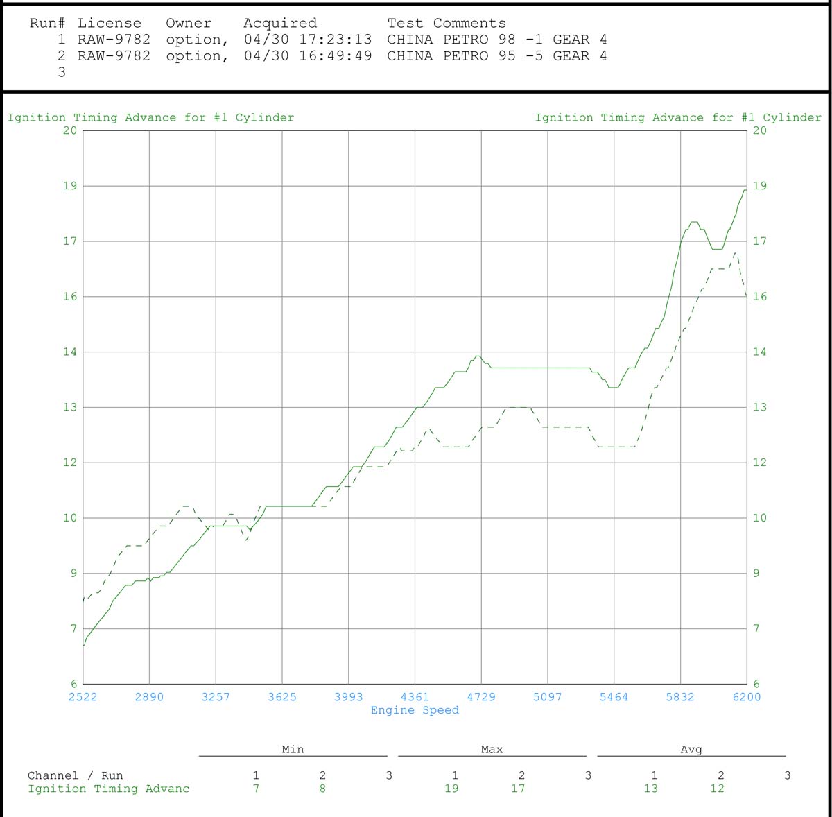 而這樣的油品組合如果面對引擎壓縮比高達14.0的2015年Mazda 3上,其各自的表現又是如何呢?答案是98汽油的優勢更能發揮出來。從馬力/扭力圖來看,實線為中油98,虛線為中油95,前者在4500rpm之後將扭力差距拉開達0.8kgm,並且一路維持到斷油前,最大馬力也在此時機點拉開達3hp的輪上馬力,整體差距一樣明顯。而這樣的情況也反映在點火時間上,98汽油同樣可維持較早的點火時間,看來不論高低壓縮比的車款,只要是98汽油都對性能有正面幫助,不過差距不大就是了,對於多數車主來說,為了這點性能提升而改用比較貴的98汽油,機會應該很小。