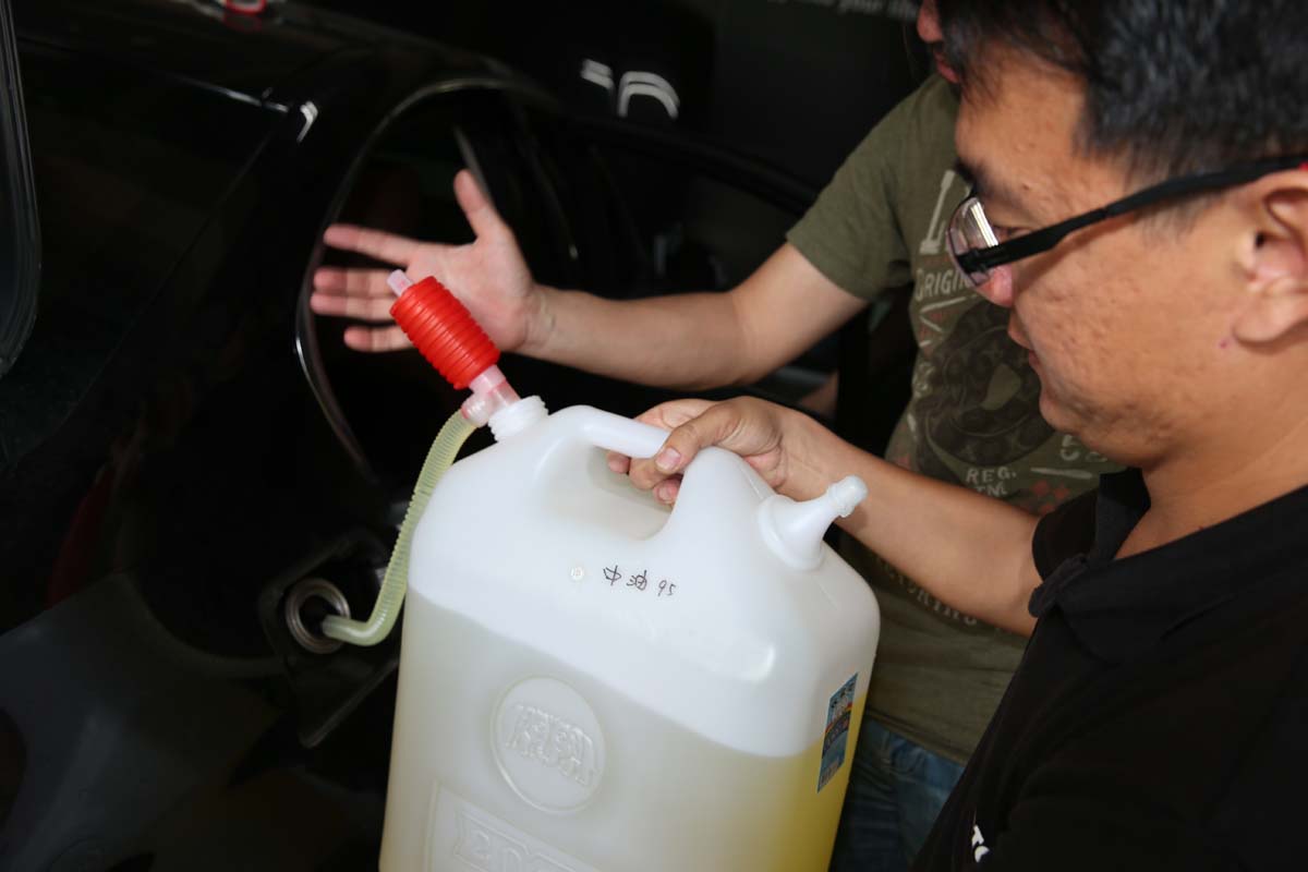 | 原本加油時還有一根吸管可用,後來這根吸管被筆者用壞了,汽油吸不起來,只好想辦法用倒的方式,配合用寶特瓶做的臨時漏斗來加油,測試時的「驚奇」真是無所不在,只能靠臨場反應。 |