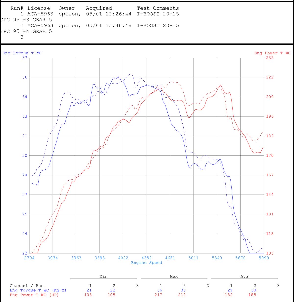 | 從馬力/扭力的曲線圖來看,其中實線為中油95汽油,虛線為台亞95+汽油,中油95汽油是贏少輸多的局面,最大的落差點應該在4700rpm左右,此時中油95的輪上馬力約為206.8hp、扭力約為32.3kgm,台亞95+的輪上馬力則為221.8hp、扭力為34.5kgm,兩者差距達15hp/2.2kgm,差距可謂不小。 |
