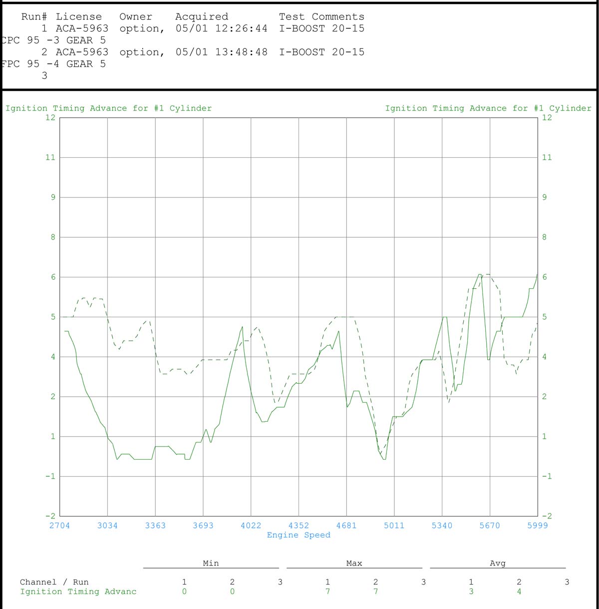 點火正時的曲線圖部分,實線為中油95汽油,虛線為台亞95+汽油,整張圖很明顯的看到虛線的低轉速的表現好過實線,尤其在3700rpm之前,不過在過了此轉速點時後,兩者的差距就拉近許多,整體來說還是以台亞95+的爆震抑制能力比較好,而這樣的特性也實際反應在馬力/扭力圖上。