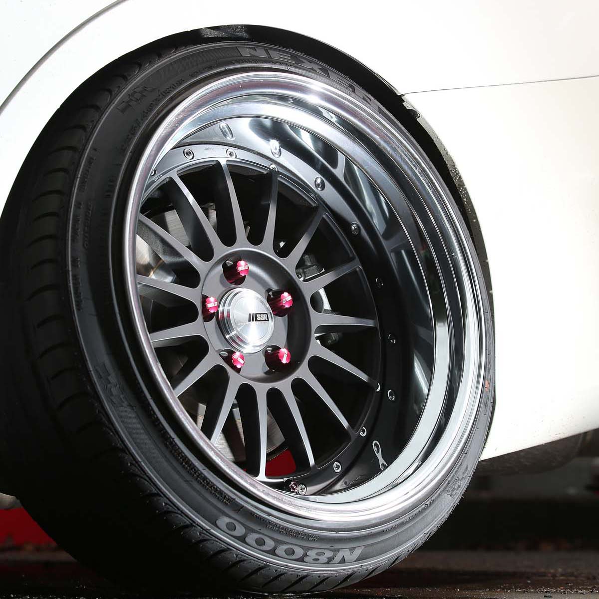 | SSR TF1三片式鋁圈是車主特別為該車所購入,不過前9J ET24的規格還讓車主多墊了20mm才達到想要的視覺效果,後10.5J ET-8的規格就是帥哥一枚,直接凹到-8度Camber在路上開起來想不被注意都很難。 |