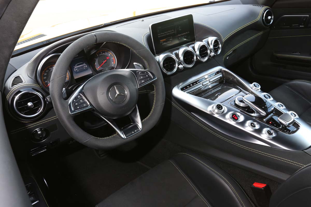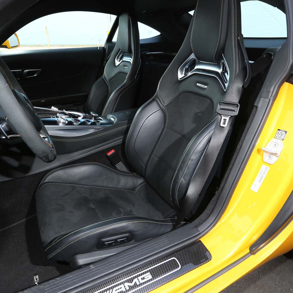 除了視覺上的氣氛外,車艙裡的兩張座椅也是一絕,GT S車上把AMG高性能跑車座椅列為標準配備,這一對座椅造型非凡,在GT車上還是列為得加價的選用配備,這兩張椅子為駕駛者與乘客提供了極佳的包覆性,支撐性也相當良好,但它是非常硬派的設計,完全不是舒適款的版型,就算是自家的動態多重支撐跑車座椅,在這兩張硬派的椅子面前也顯得兒戲;當然,也不用想在這樣的座椅上尋找乘坐舒適性。