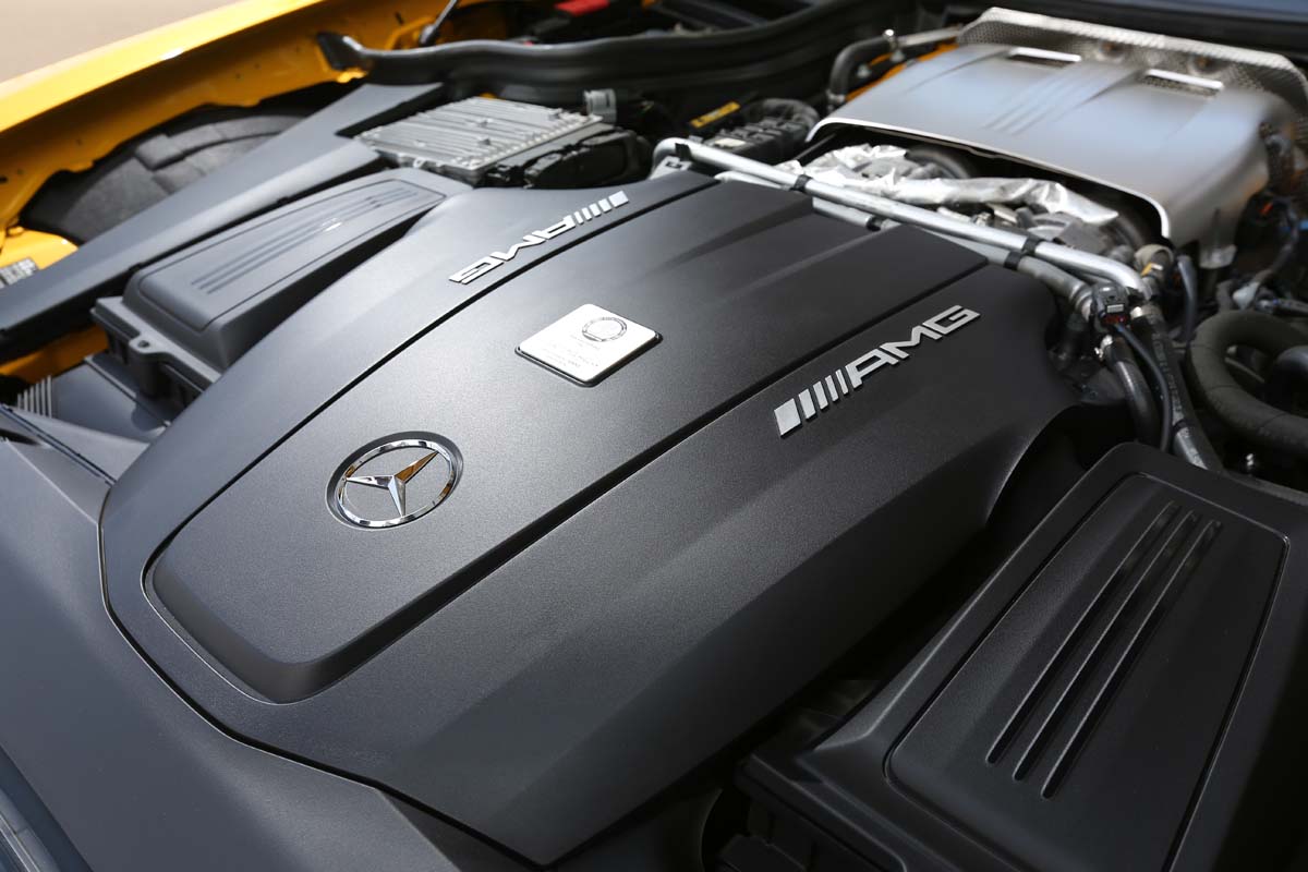 GT S車上的雙渦輪增壓V8引擎是新世代的AMG製品,它跟其他63車型使用的V8引擎一樣採用「Hot inside V」的架構,把兩具渦輪增壓器安裝在V型引擎的兩排汽缸之間,縮短了整體的進排氣路徑,藉此提昇增壓效率。而為了配合GT S的整體低重心設計,這具V8引擎特別採用了乾式油底殼,當然另一方面也是為了確保極限操作下引擎的潤滑效果。