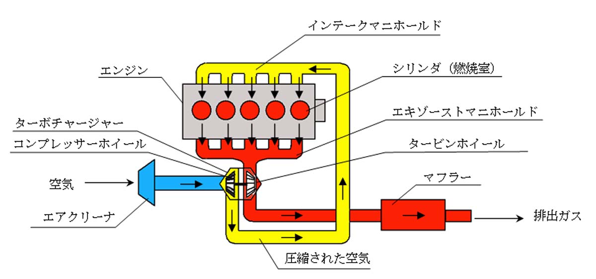 屬於強制進氣的一種,渦輪增壓(英:Turbo Charger),小小一顆渦輪機可擁有高達20萬轉以上的工作效率,並且將大量的空氣吸入後一口氣導入燃燒室內,讓空氣中的含氧量是一般自然進氣的倍數以上,藉此換取更可觀的出力,但這個「壓縮空氣」所帶來的高熱能,正是TC渦輪增壓長久以來的致命傷,不過那爆炸性的出力卻又讓人類不斷的去征服它。