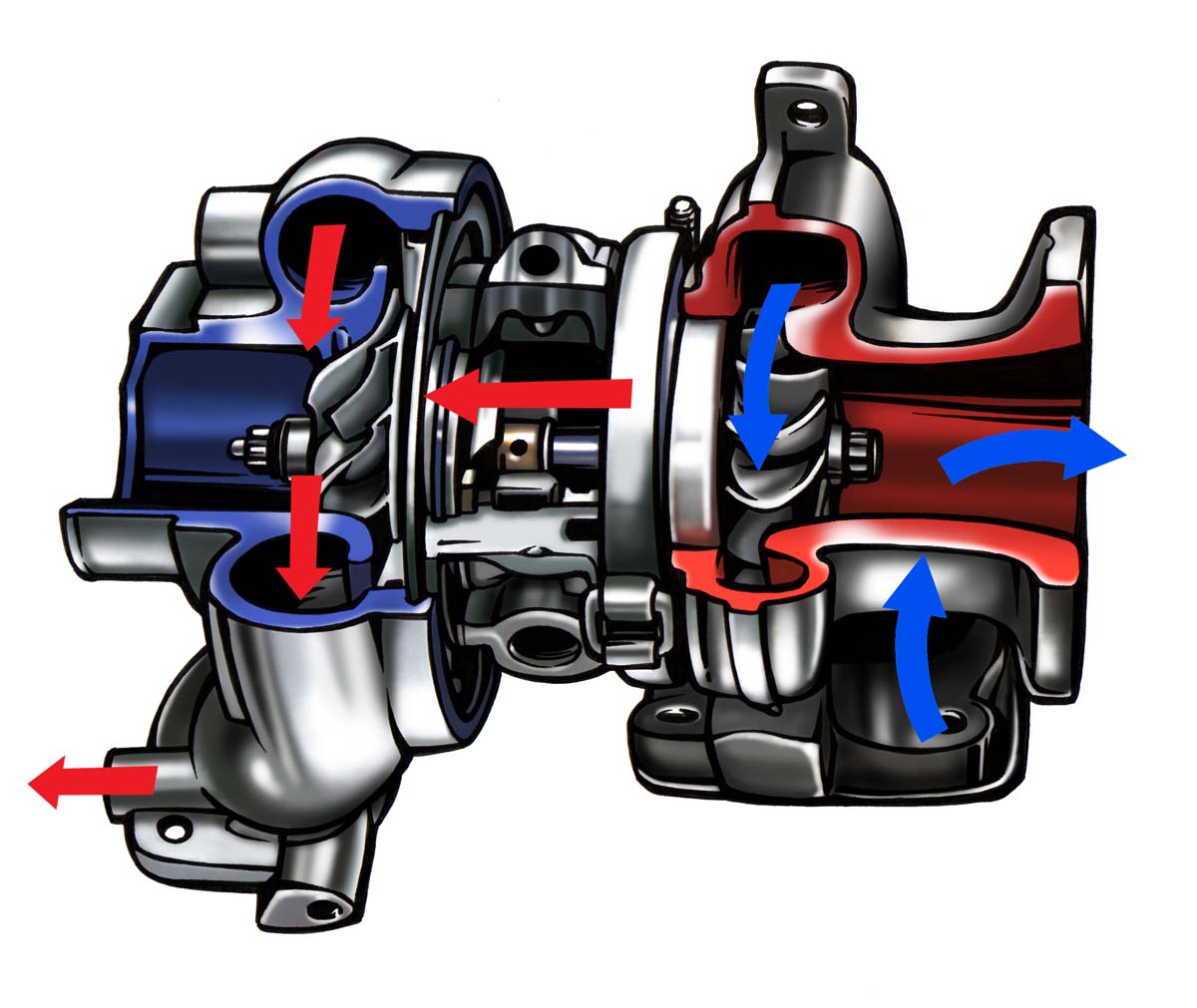 而拜更嚴苛的環保標準所賜,在大家都把引擎縮小下,渦輪增壓成了目前最流行的動力設定,其原理主要是利用排廢氣的壓力驅動渦輪,並且以渦輪帶動同軸的空氣壓縮葉片,壓縮吸入的氣流再送往汽缸。一般自然進氣的引擎是藉由汽缸內活塞下降的負壓來吸入混合氣,因此被吸入的混合氣其壓力在理論上是沒有辦法達到正壓,不過渦輪增壓則是可將混合氣壓力達到正壓以上反應,這也是渦輪增壓為何被運用在氣壓低的航空環境,藉由高溫、高壓的廢氣循環來驅動渦輪葉片,理論上以每分鐘10-20萬轉的高轉速運作,只要硬體許可提升倍數上的動力也是沒問題。