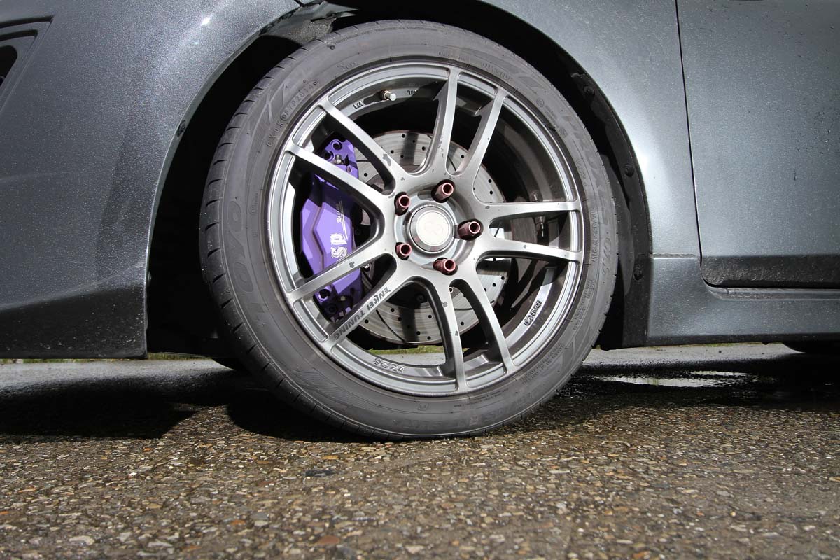 | 底盤強化部分則已改裝國威技研自家推出的SP-Racing道路版改裝避震器、SP-Racing大六活塞卡鉗+330m碟盤、SP-Racing小六活塞卡前(具手煞車功能)、Toyo C1S 215/45R17輪胎與Enkei 17吋鋁圈進行強化。 |