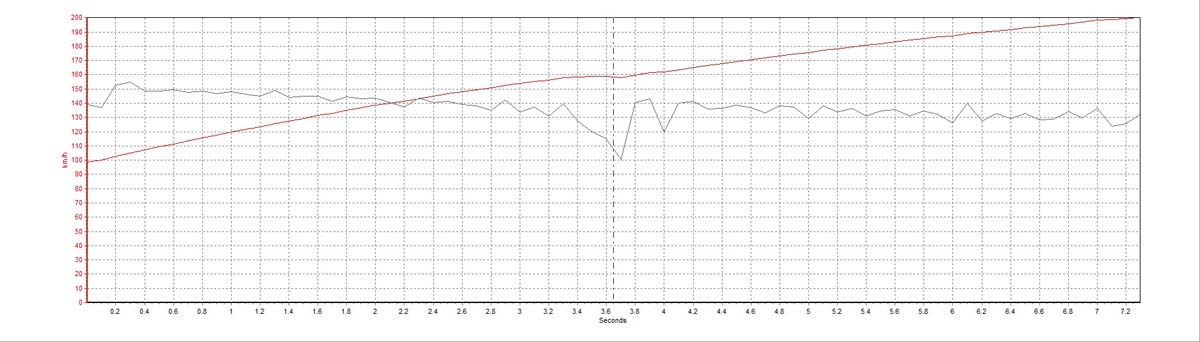 架上D-Box實測0-100km/h的表現,在溼地路面上經過三次測試,最佳一筆成績為7.2秒,比Tiida 1.6T的7.6秒原廠成績更快,當然也勝於Focus 1.5T的8.7秒,更不用說同款2.5S筆者過去實測的9.0秒加速水準,看來只要車主願意,即使舊款的自然進氣引擎,只要透過加裝渦輪增壓系統,還是能讓愛車動力表現脫胎換骨。