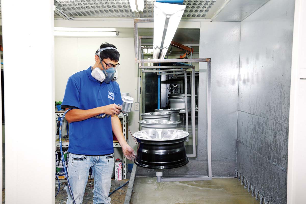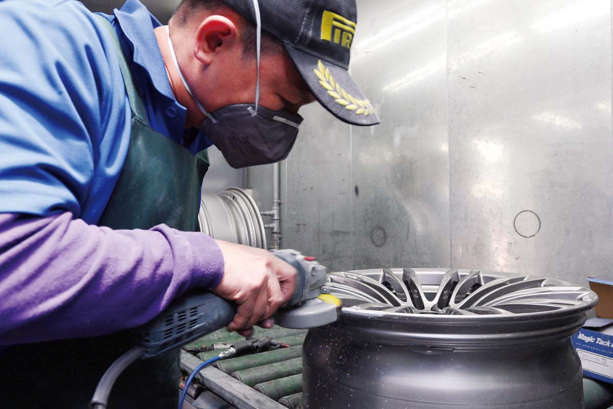 一般輪圈上少於2公分的傷痕,可以透過研磨拋光進行修復(超過便需補鋁料),首先要針對傷痕程度選擇相對應研磨砂進行研磨,研磨完後便進行拋光,為了讓之後上漆時漆面更能緊貼輪圈,因此會將原本輪圈的烤漆進行基本拋光去漆處理。接著噴上底漆準備進行上色與155度高溫烘烤工程,陰乾後再次進行金油層烘烤,上述修復流程通常一個工作天內便可完成。至於烤漆部分,通常亮光、消光或是電鍍輪圈皆能修復,唯獨原廠推出的切削款式輪圈,在重新切削後細膩精緻度會與原廠有所差距。