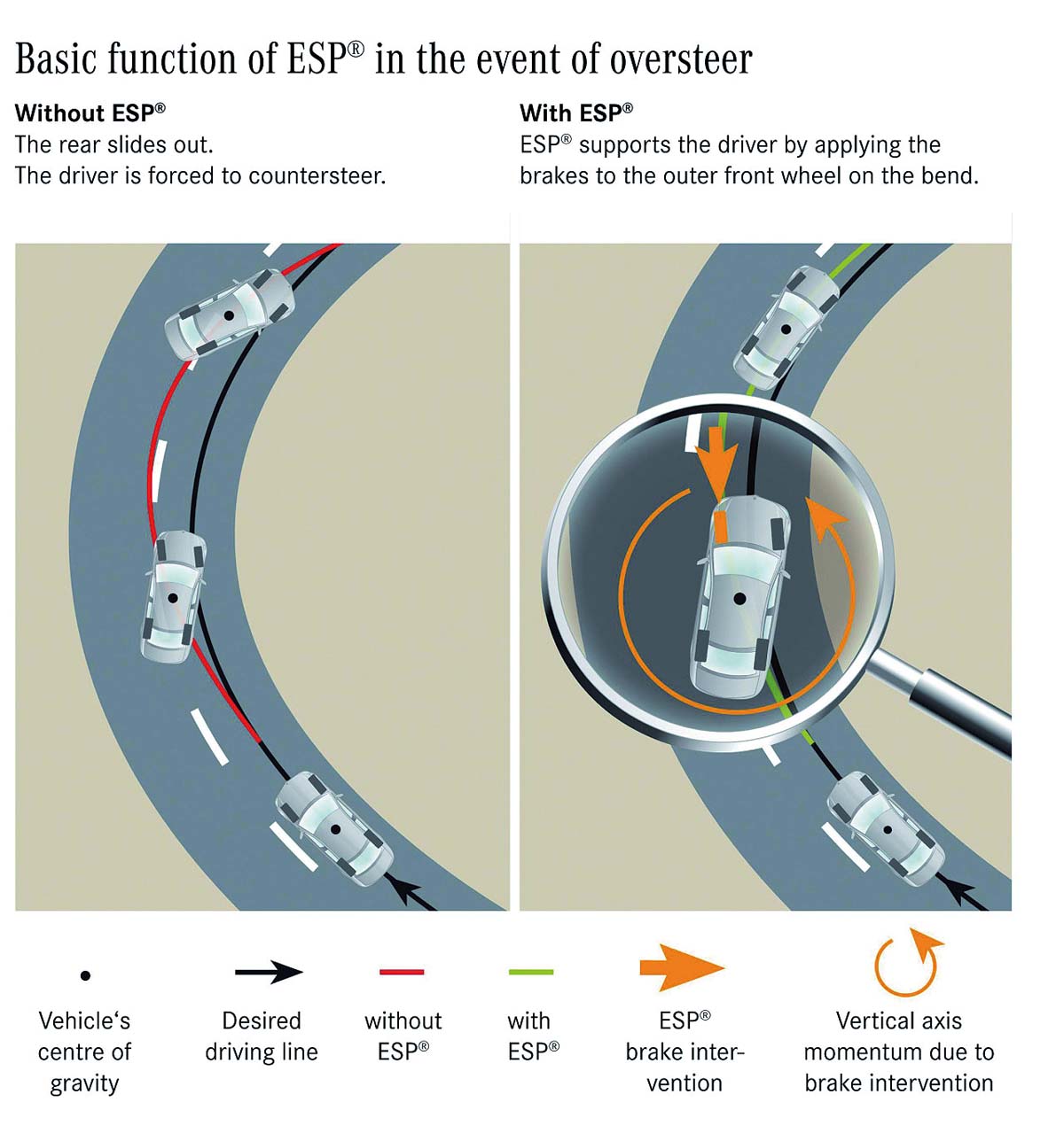 本頁左上圖1為未搭載ESC之車輛,當車輛在過彎時可能因車速過快而導致轉向不足(紅線),偏出原行駛的正確 路線而造成危險(黑線);反之,左頁圖2則為搭載ESP的車輛,當系統偵測到轉向不足的情形時,電腦會針對右 後輪單獨進行制動(左彎則會針對左後輪進行制動),讓行駛時的車身慣性轉向力(綠線所示)變為順時針旋轉 ,修正轉向不足時車頭向外側偏移的狀況,及時將打滑車輛控制在正確的線路上行駛以避免危險。