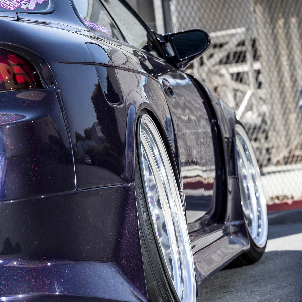 | Work前18X9.5J、後19X11.5J的輪圈,配合車高降低至輪拱切齊輪框,毫無違和感的設定難怪能贏得許多美國當地的改裝大獎。 |