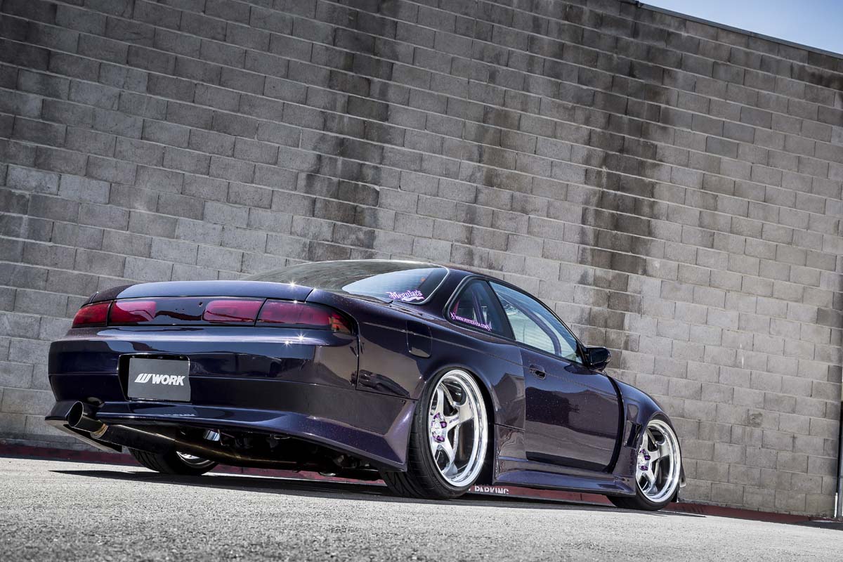不過既然要車高能夠大幅降低貼近地平線,又要可以正常使用,首要目標當然就是懸吊系統的升級,但是有別於氣壓避震器可調整高低的升降功能,透過Stance GR+可調避震器大幅降低高度,若照原有多連桿結構來看應該沒什麼問題,不過為了要容納Work前18X9.5J、後19X11.5J的輪圈,因此仍是必須透過Cusco後仰角調整器讓Camber達到-9度能夠與輪拱呈現一拜的組合,其餘底盤方面則透過Wicked拉桿以強化車體剛性。配合底盤上的變化,既然是對味的日系改裝車代表,Nissan 240SX外觀當然不能夠馬虎帶過,為此特別準備Vertex Ridge寬體外觀、定風翼與尾翼等套件,然而透過修長的雙門跑車線條下,想不帥真的都很難。