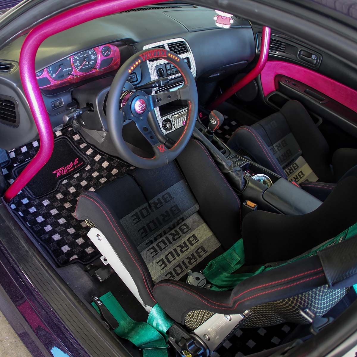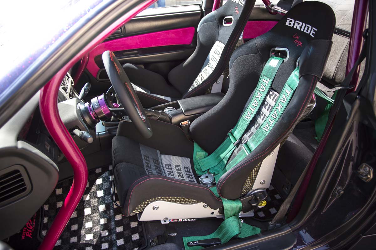 整台車透過改裝之後幾乎達到當初設定的目標,但是與駕駛息息相關的內裝仍不馬虎,畢竟這可是每次開車時人車能否合而為一體的重要關鍵,因此兩張具包覆及支撐性的賽車椅當然不可少,為此特別換上兩張BRIDE GIAS II怪獸椅,強悍的性能味儼然成形,而配合賽車椅升級,原車安全帶似乎也已經不敷使用,基於安全性的考量特別採用TAKATA四點式安全帶將車內駕駛與乘客牢牢綁在座椅上,不過既然是日系熱門改裝車,內裝方面當然不可能只有這樣程度的改裝調整,為了駕駛良好的「手感」還換上VERTEX方向盤與排檔頭,感覺上引擎輸出馬力瞬間暴增100hp,加上客製化粉色系麂皮內裝與CUSCO七點式防滾籠輔助下,即使車齡已將近20年的老車仍然看不出其老態。
