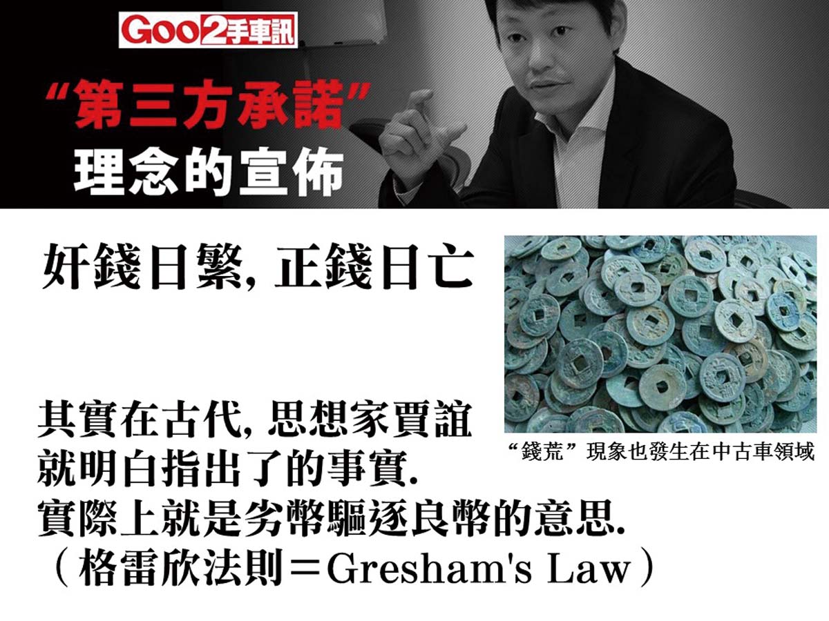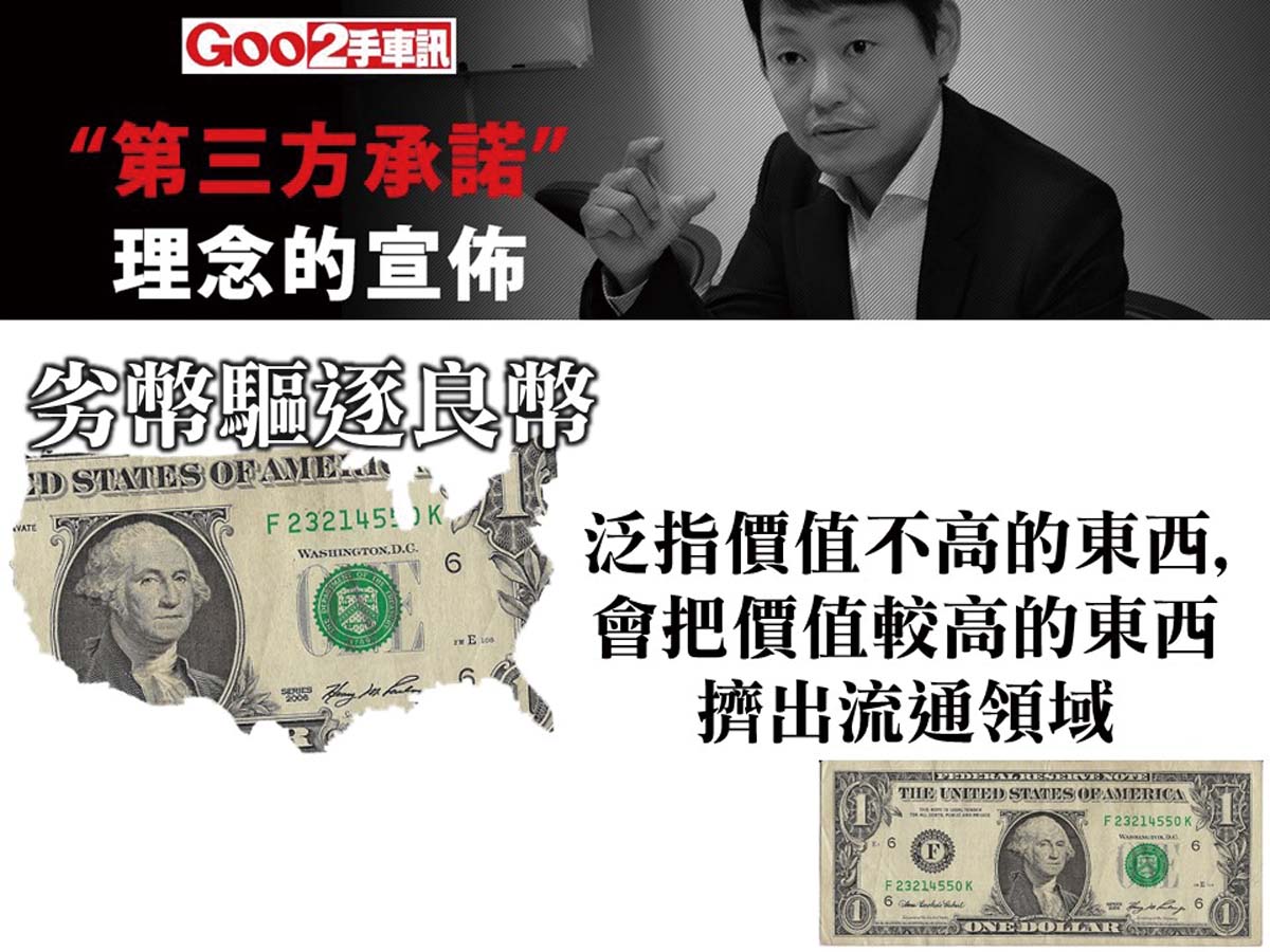 所謂「劣幣驅逐良幣」,泛指價值不高的東西會把價值較高的東西擠出流通領域。台灣的中古車市場也是典型「劣幣驅逐良幣」的狀態。